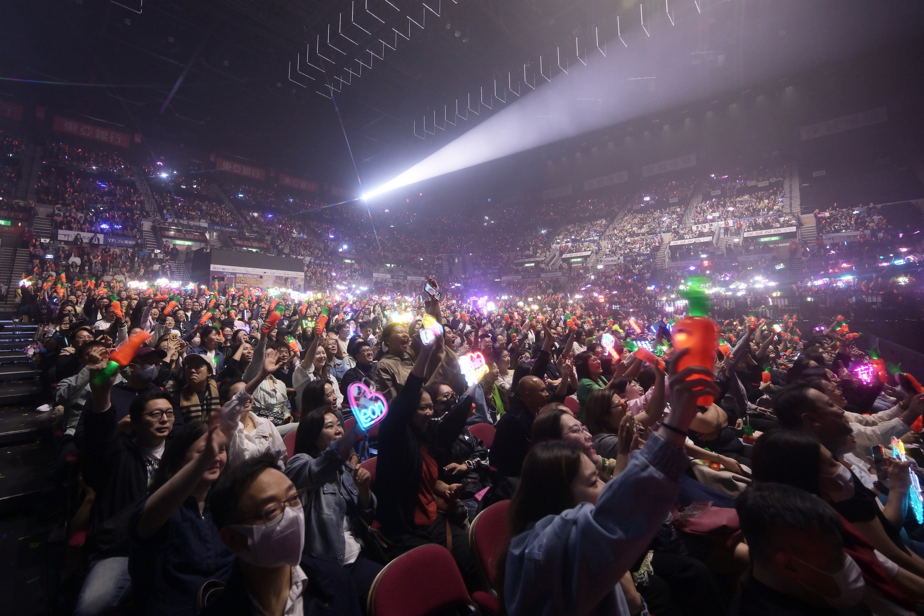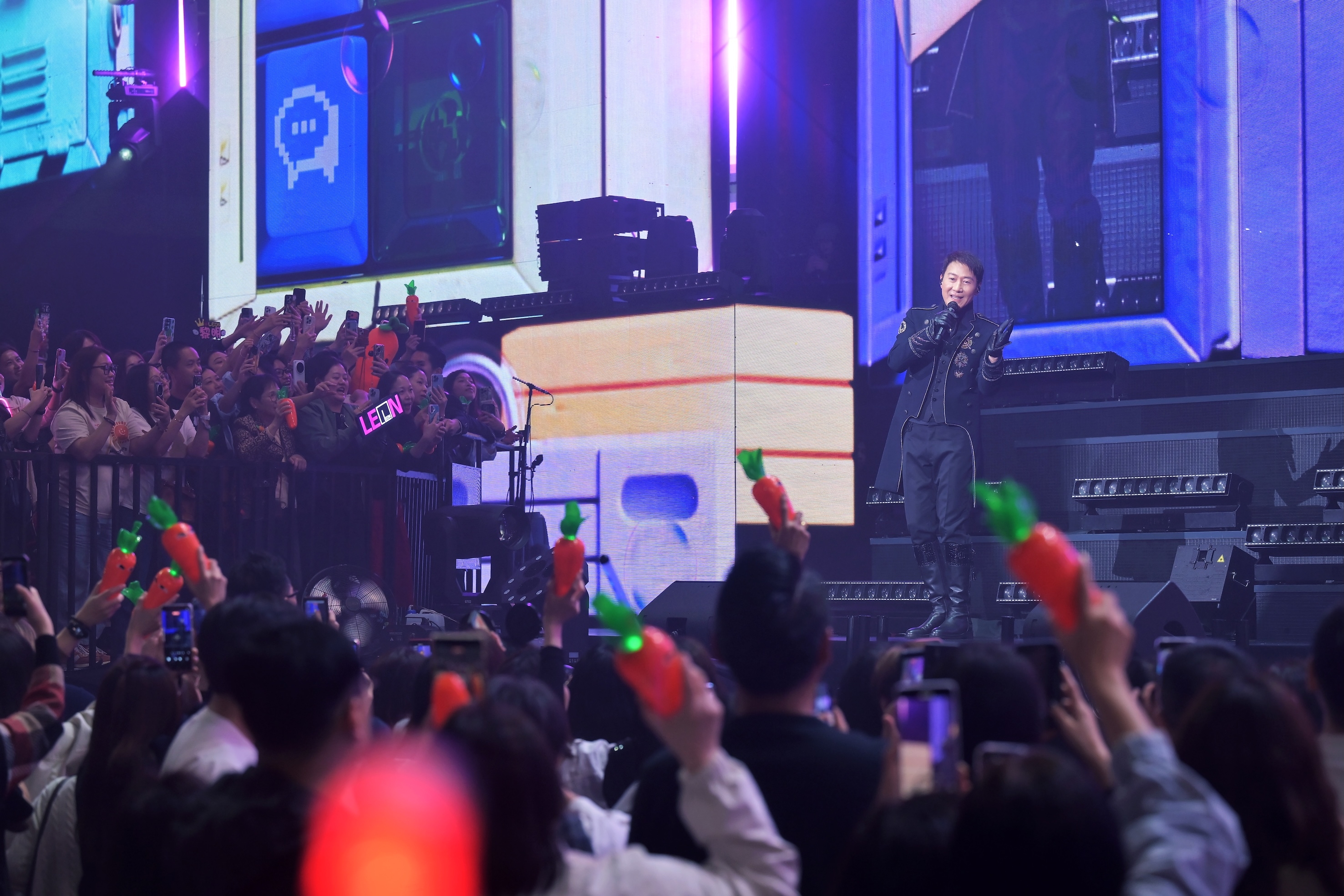 黎明紅館演唱會星期日晚起於紅館展開,Leon一連十晚帶領觀眾感受集視覺、聽覺、觸感嘅音樂派對。Leon嘅繼續毫不吝嗇製作,今次更大手筆向每位觀眾送上「紅蘿蔔」手燈,歌迷紛紛同手燈selfie,更有人指不捨拆盒。紅館出現一片「紅蘿蔔」燈海,配合多首耳熟能詳嘅「明曲」,歡呼聲、尖叫聲同歡笑聲震撼紅館。