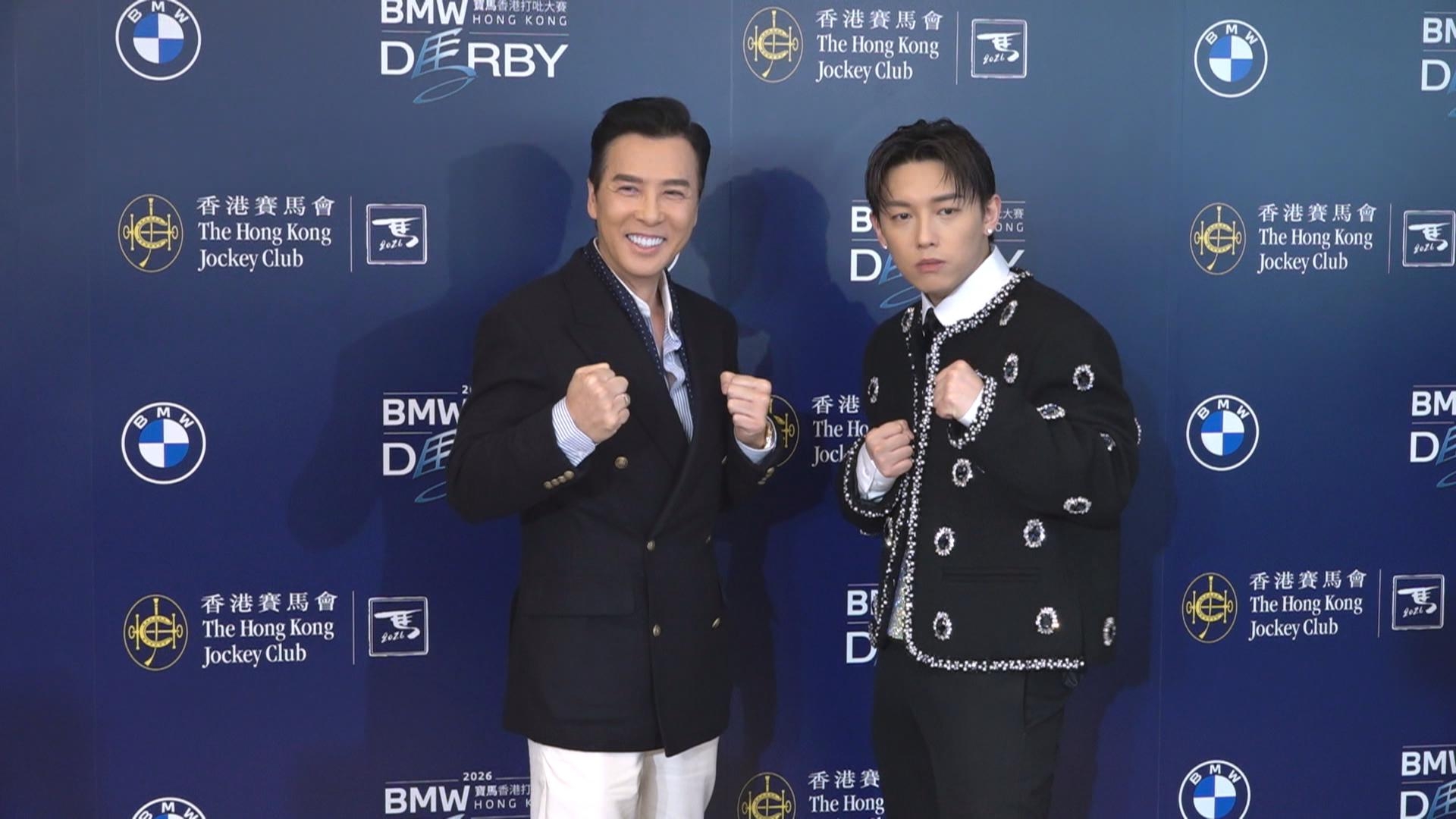 甄子丹 同 張天賦 喺馬場現身,見到呢個組合就覺得熟口熟面,兩人之前曾經喺電影上合作,呢日重逢時MC都要學丹爺擺返個型格甫士迎合吓最強前輩,丹爺更大讚MC係新晉年輕人中既靚仔又積極,希望再有機會合作。