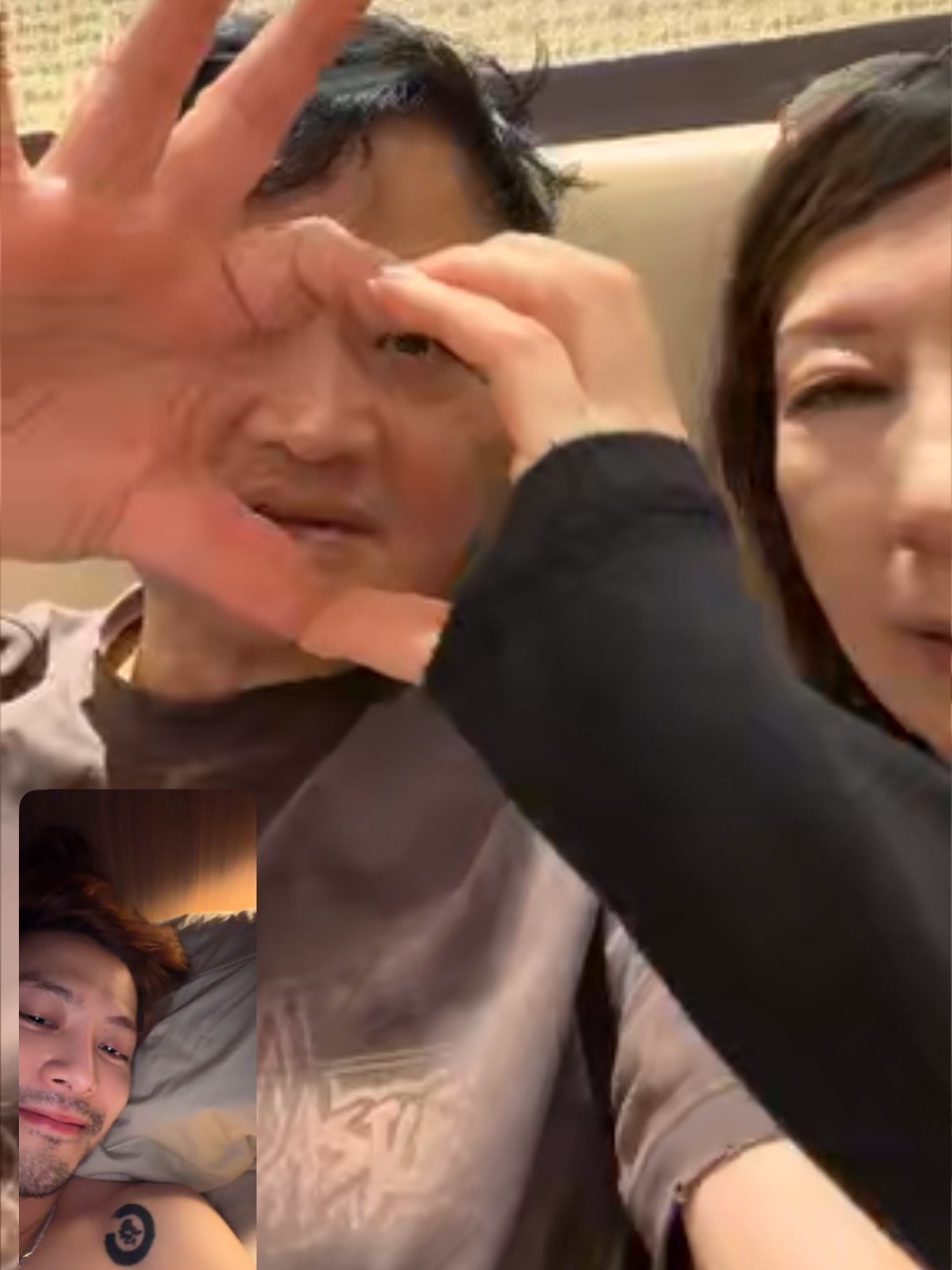 今個月28號係 王嘉爾Jackson 嘅32歲生日,由於佢要到墨西哥出席音樂節,所以只好以視像同父母隔空慶祝生日,佢上載咗多張同父母視像嘅截圖到社交平台。疑似喺酒店房同父母作睡前通話嘅Jackson,一改平日清爽乾淨嘅形象,佢赤膊上身滿臉鬍鬚入鏡,盡顯粗獷猛男一面,而王媽媽則依偎住王爸爸,兩人更以手指組成一個心形送畀囝囝,相當溫馨有愛。![]()