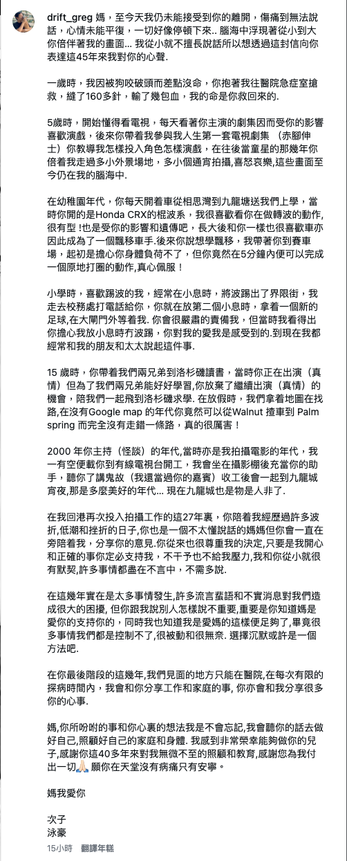 最後,泳豪憶述與媽咪嘅最後時光:「在你最後階段的這幾年,我們見面的地方只能在醫院,在每次有限的探病時間內,我會和你分享工作和家庭的事, 你亦會和我分享很多你的心事。媽,你所吩咐的事和你心裏的想法我是不會忘記,我會聽你的話去做好自己,照顧好自己的家庭和身體。我感到非常榮幸能夠做你的兒子,感謝你這40多年來對我無微不至的照顧和教育,感謝您為我付出一切, 願你在天堂沒有病痛只有安寧。」![]()