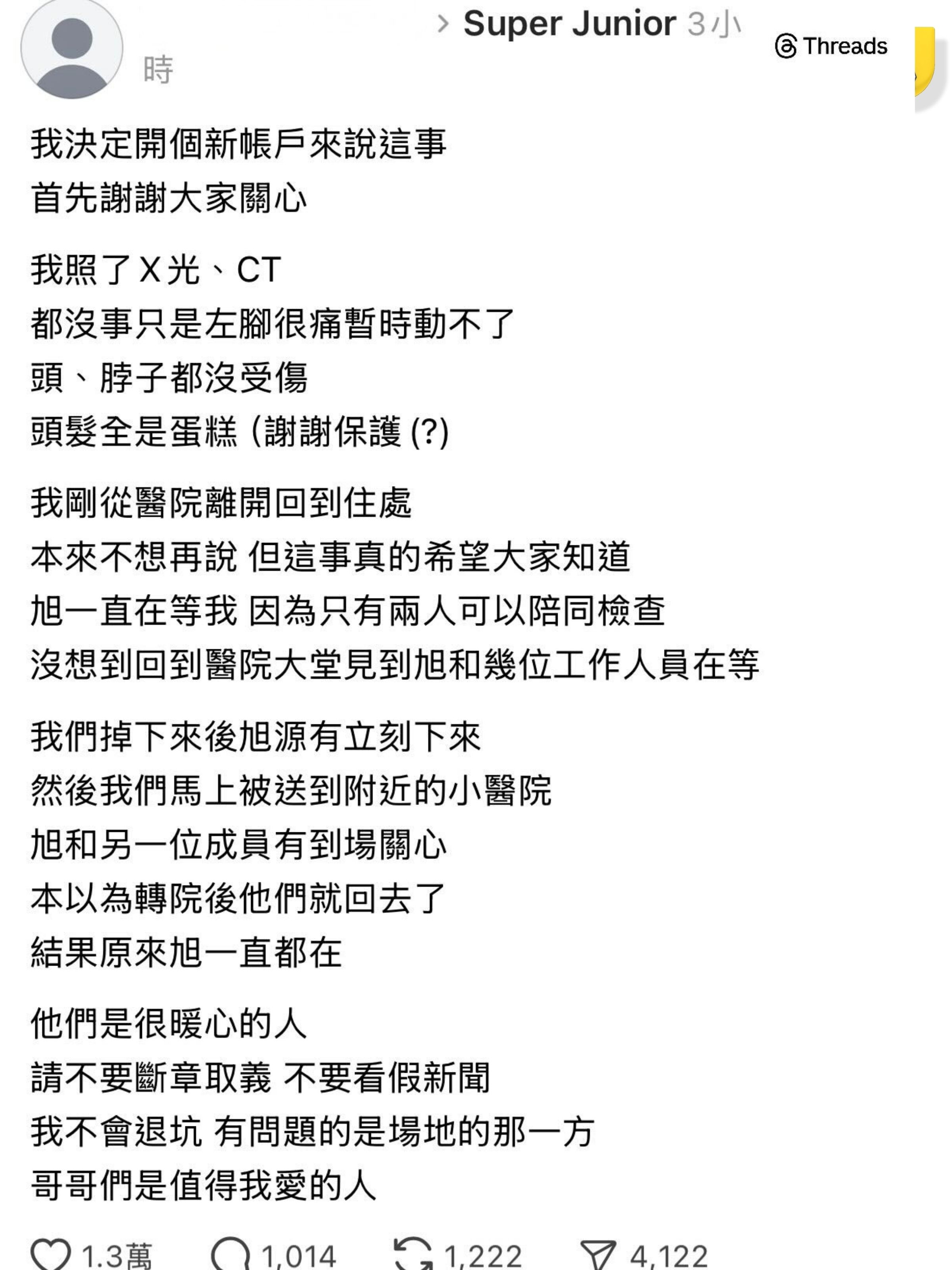隊長利特亦拍片回應意外,指成員都非常擔心。為確保受傷ELF未來不再受到傷痛困擾,成員以及SM工作人員會竭盡全力,共同提供後續照顧與協助,希望傷者早日康復。