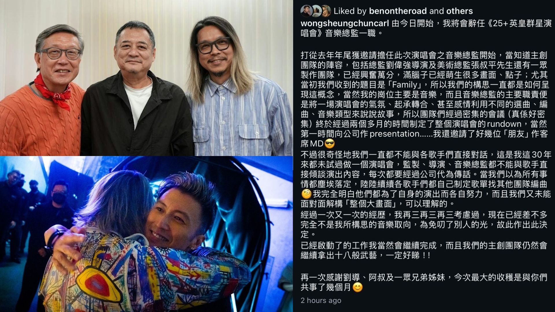 《25+英皇群星演唱會》舉行在即,音樂製作人王雙駿(Carl)噚日凌晨發聲明宣布將辭任演唱會音樂總監一職,又指喺籌備過程感到非常奇怪,一直未能與各歌手們直接傾談演出內容,每次要經過公司代為傳話,以為所有事情都塵埃落定,陸續歌手們都自己制定歌單搵其他團隊編曲,Carl經過再三考慮,認為完全跟自己所構思嘅音樂取向不同,「為免叨了別人的光」,故此作出此決定,而英皇娛樂亦作出回應!