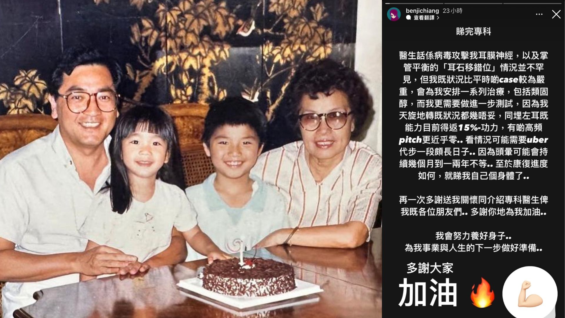 秦沛兒子姜文杰日前患上重感冒,嚴重後遺症左耳現暫時失聰,佢噚日喺IG動態留言交代病况,透露深夜開始嚴重頭暈,佢成晚趴喺馬桶,只要稍微郁吓都會嘔最後終於頂唔順,呢10幾個鐘頭佢黃膽水都嘔埋出嚟,由於星期日搵唔到專科,佢只好去醫院急症求醫。![]()