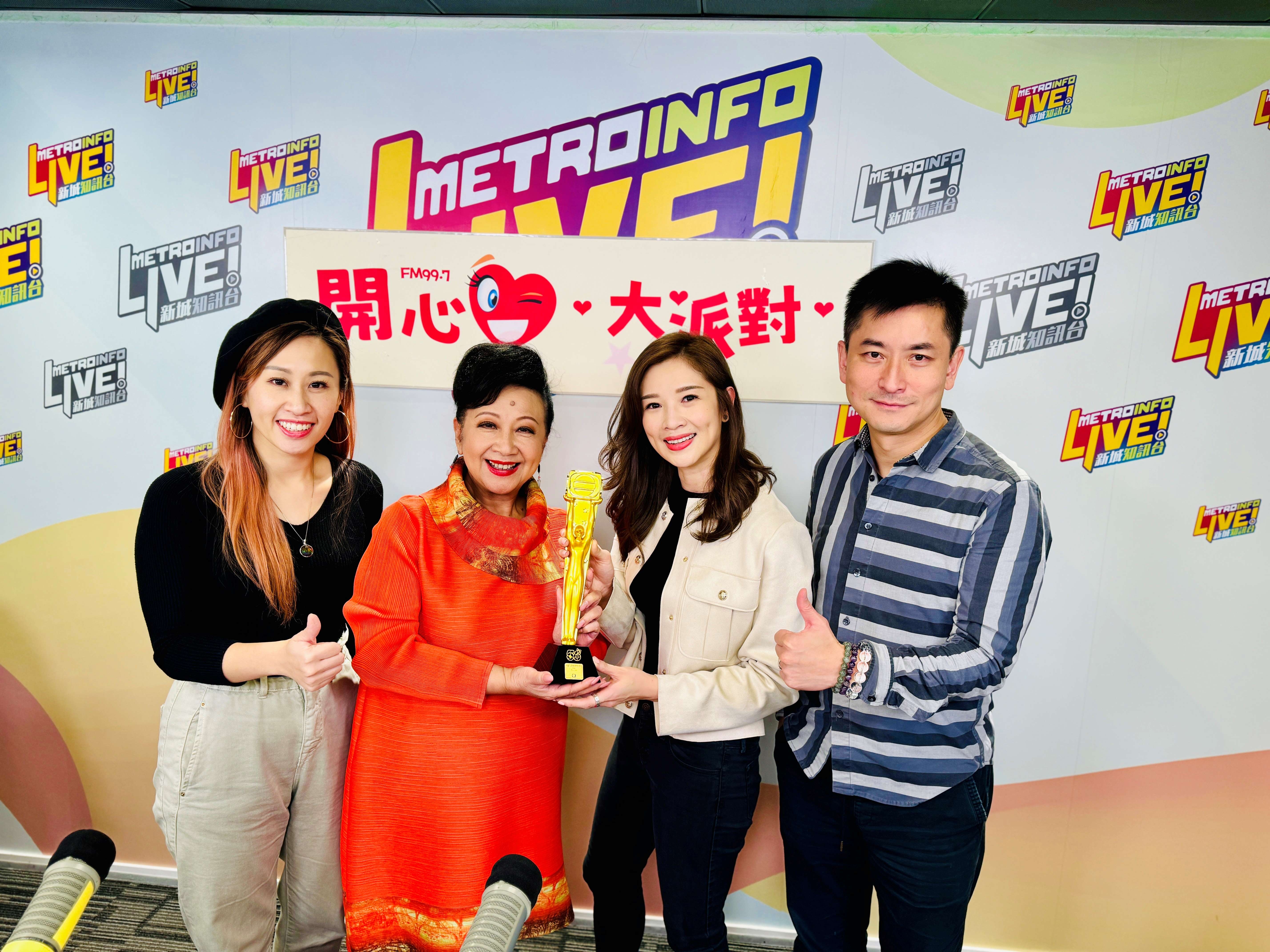 新鮮出爐《萬千星輝獎典禮2023》奪「最佳女主持」嘅麥美恩(Mayanne)噚晚帶同獎座接受電台錄音訪問,佢大談得獎感受,主持人薛家燕、范振鋒及思敏祝賀麥美恩。![]()