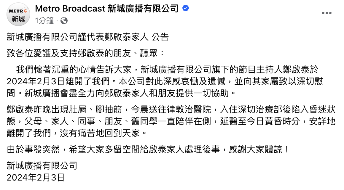 日前鄭啟泰應邀重返新城電台擔任主持,當日更親自買玫瑰贈與公司女同事慶祝,又宣佈與同居女友好事近,已求婚成功。新城聲明指,鄭啟泰昨晚出現肚屙、腳抽筋等症狀,今晨被送往律敦治醫院,被安排入住深切治療部後陷入昏迷狀態,父母、家人、同事、朋友、舊同學一直陪伴在側,可惜延醫至今日黃昏時分離世,終年56歲。