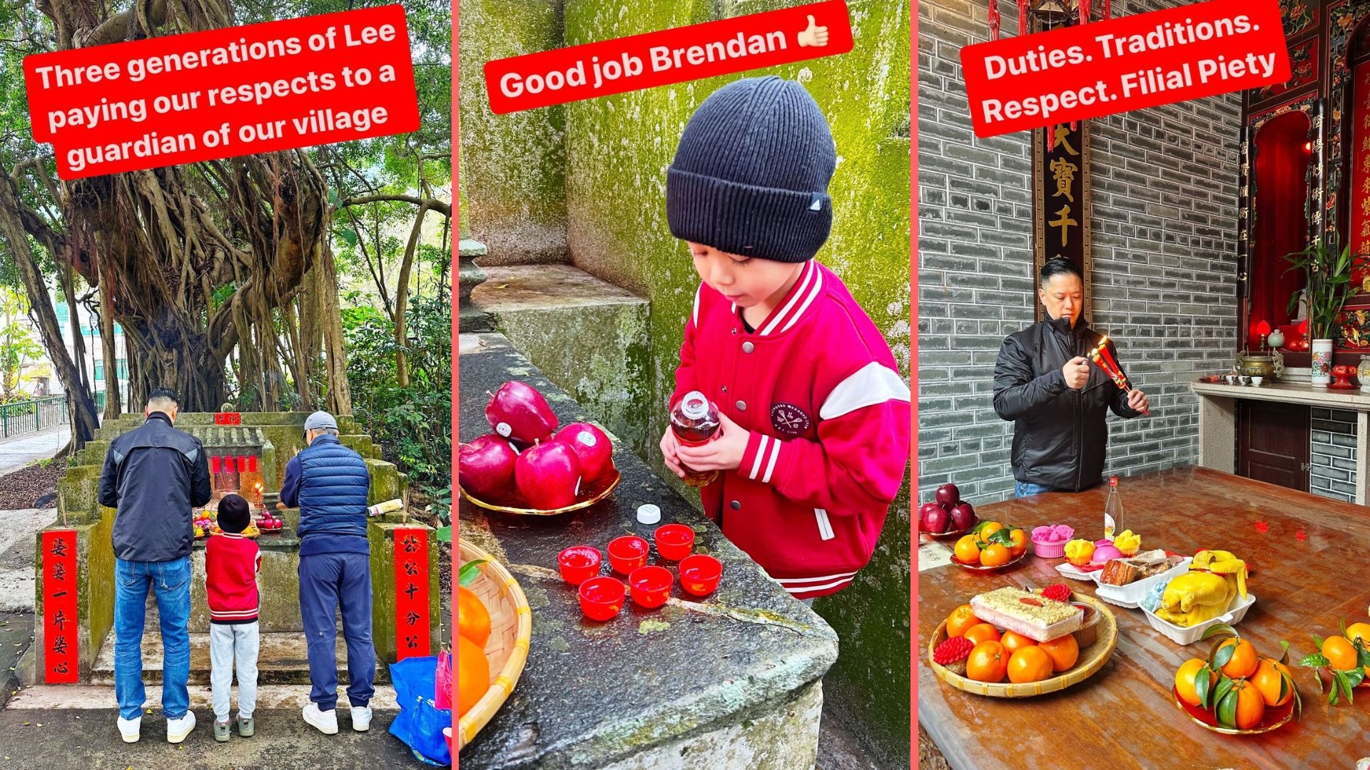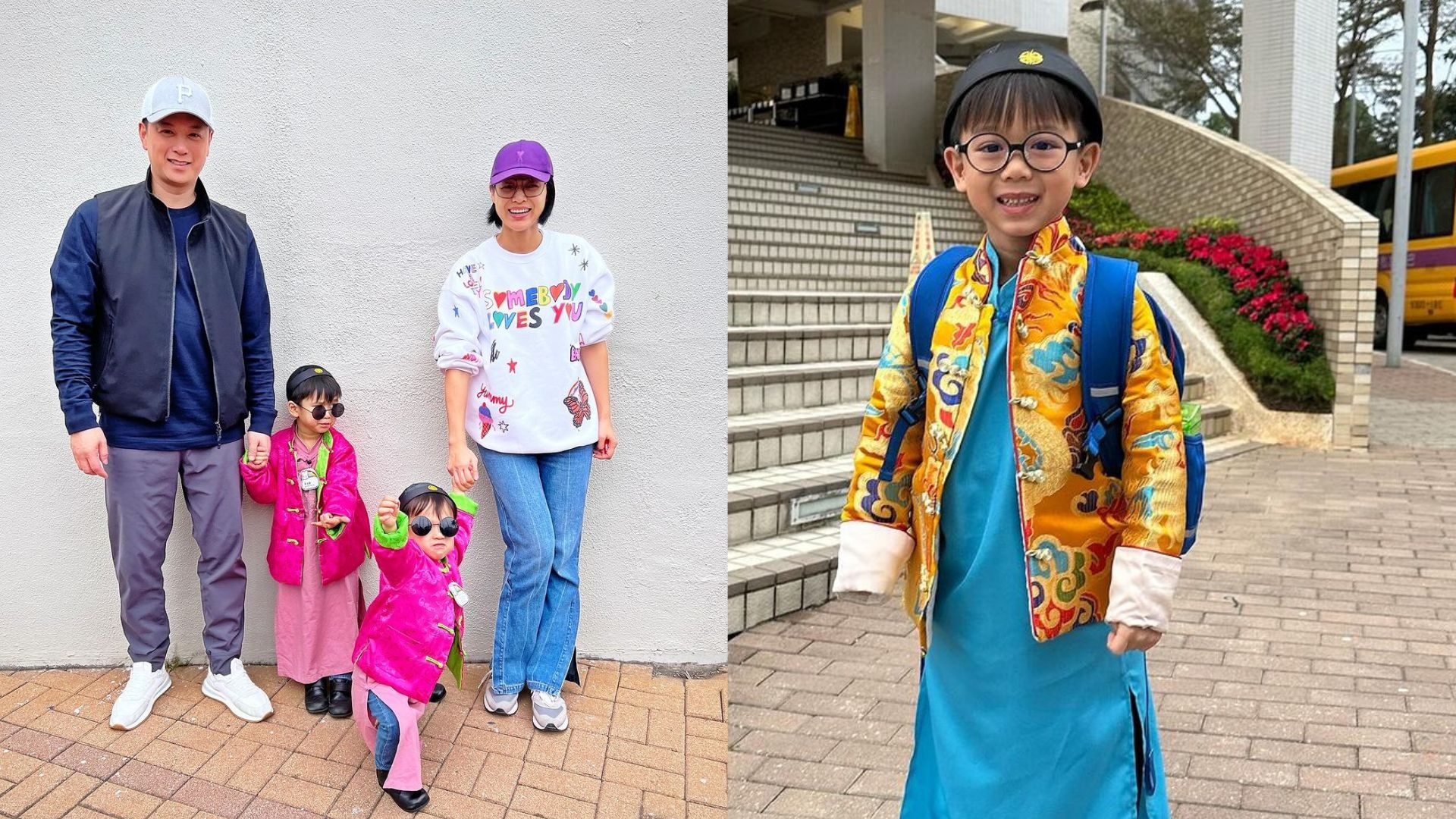 視后胡杏兒就先幫阿仔準備咗中式唐裝,二仔李奕霖(Ryan)及細仔李奕宏(Liam)著同款螢光粉紅色衫,大兒子李奕霆(Brendan)身穿黃色中式唐裝外套,非常有型!由於杏兒老公李乘德係圍村客家人,李乘德亦有帶大仔跟隨新年習俗,回圍村拜神拜祠堂。