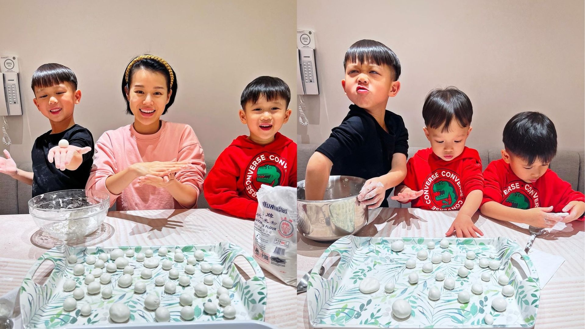 杏兒就喺年三十晚,教三個阿仔整湯圓,任由Ryan發揮創意,而Brendan同Liam都有乖乖跟住搓湯圓,一家人食湯圓,象徵着一家團圓!