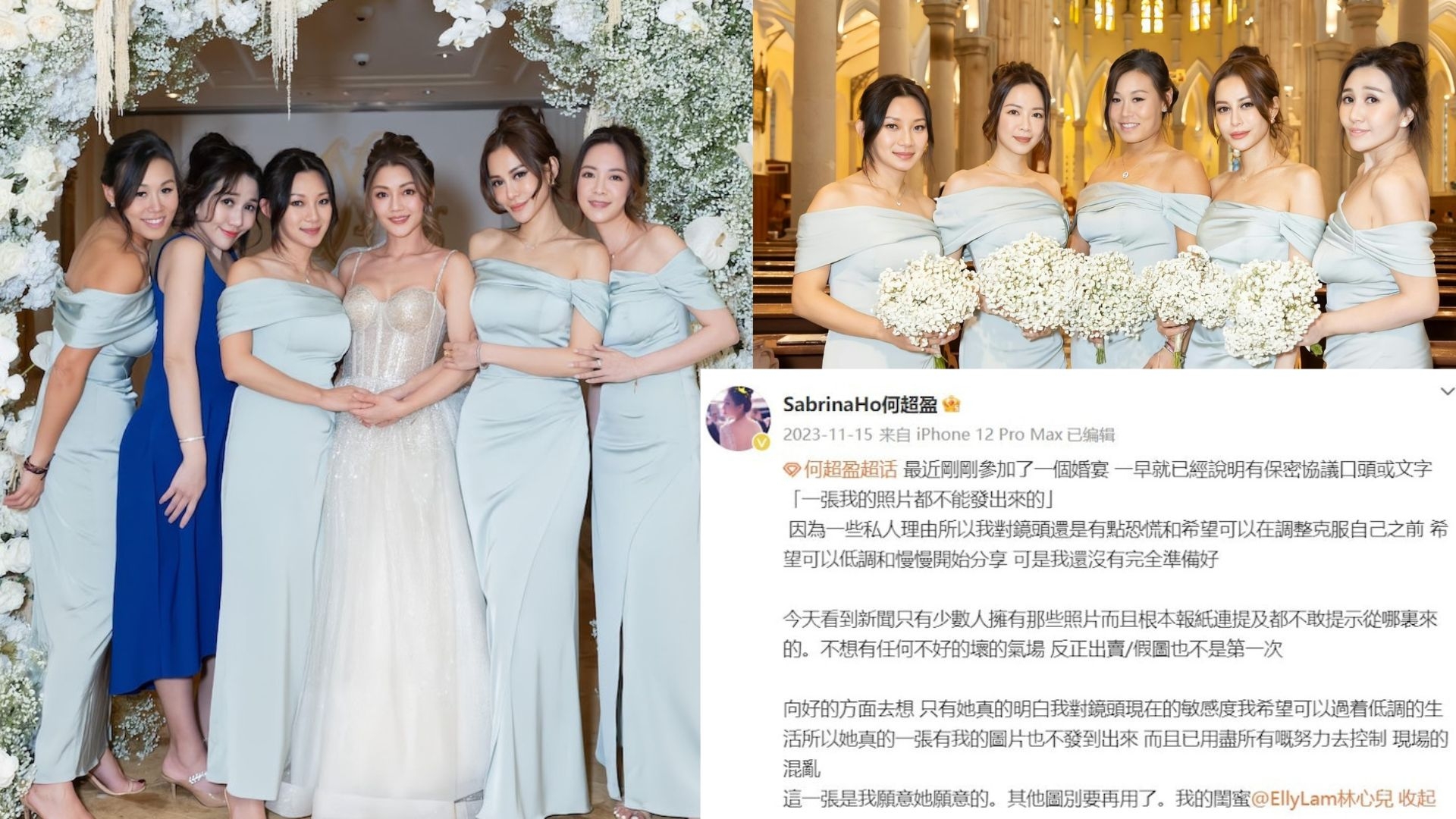 事緣超盈上年11月曾與林心兒出席婚禮兼擔任姊妹,事後佢喺微博發長文譴責,「一早就已經說明有保密協議口頭或文字『一張我的照片都不能發出來的』」,超盈自爆有社恐只想低調生活,更公開感謝好姊妹心兒體諒,只有閨密明白佢對鏡頭嘅敏感度,心兒噚日公開與超盈嘅合照,相中見佢哋現身一個慈善晚會,超盈穿貼身露膊晚裝大騷香肩玉背,表情充滿自信,超盈亦有轉發帖文,相信超盈已逐漸克服社恐。![]()