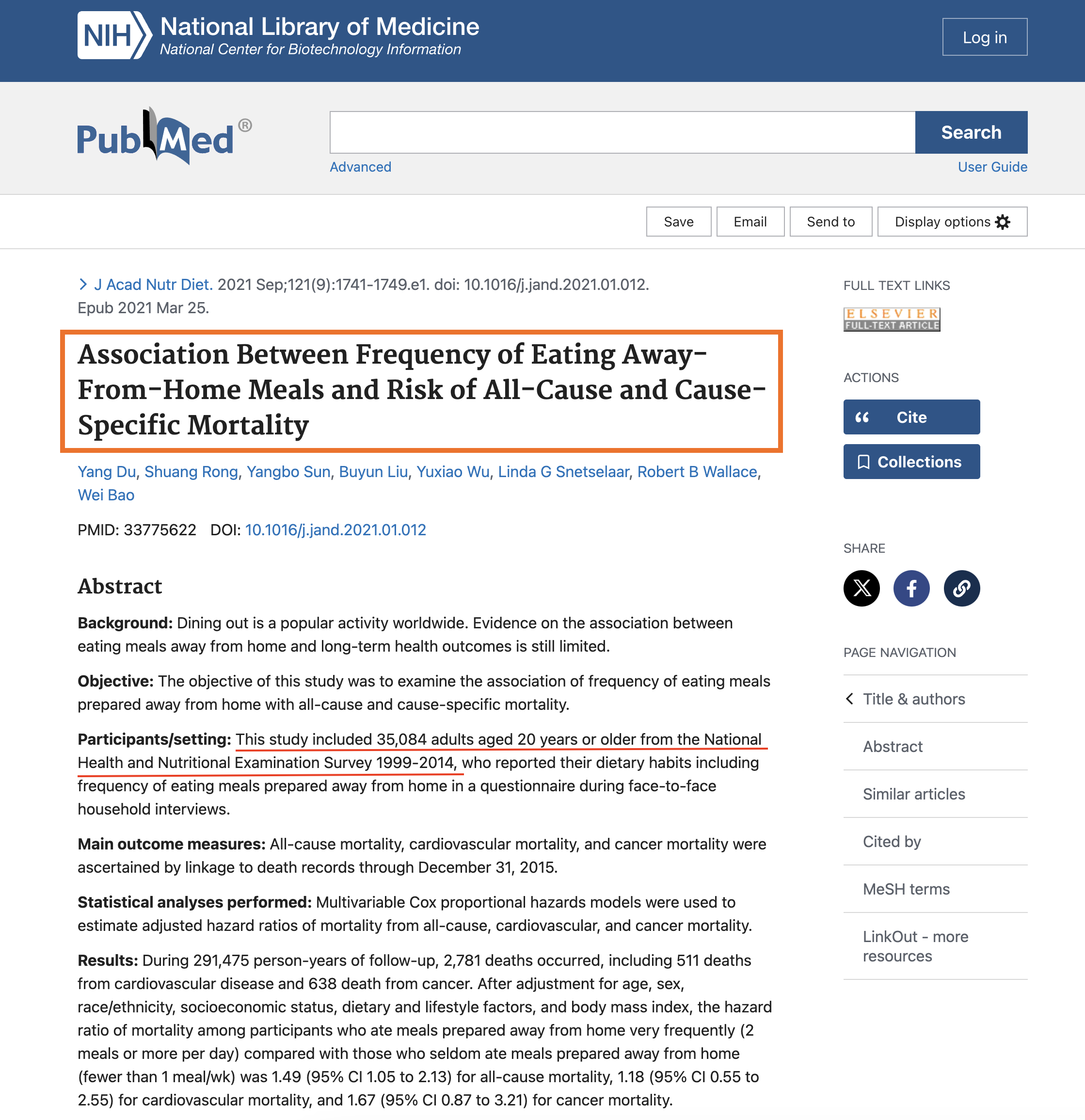 而另一來自台灣醫生黃軒分享一篇愛荷華大學公共衛生學院發表在《營養及飲食學院雜誌 Journal of the Academy of Nutrition and Dietetics》報告(研究可於美國 National Library of Medicine 找到,https://pubmed.ncbi.nlm.nih.gov/33775622),經過長達 15 年(1999-2014 年)、訪問多達 35,084 名參加者(以 20 歲以上、單身的男性為主)。最終紀錄了 2,781 死亡個案,當中 511 個案例死於心血管疾病、638 個案死於癌症,對比不外膳的人士,在死亡率、患心血管疾病及癌症的比率高很多。
