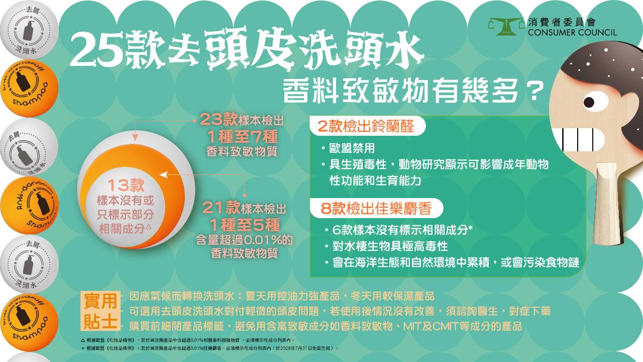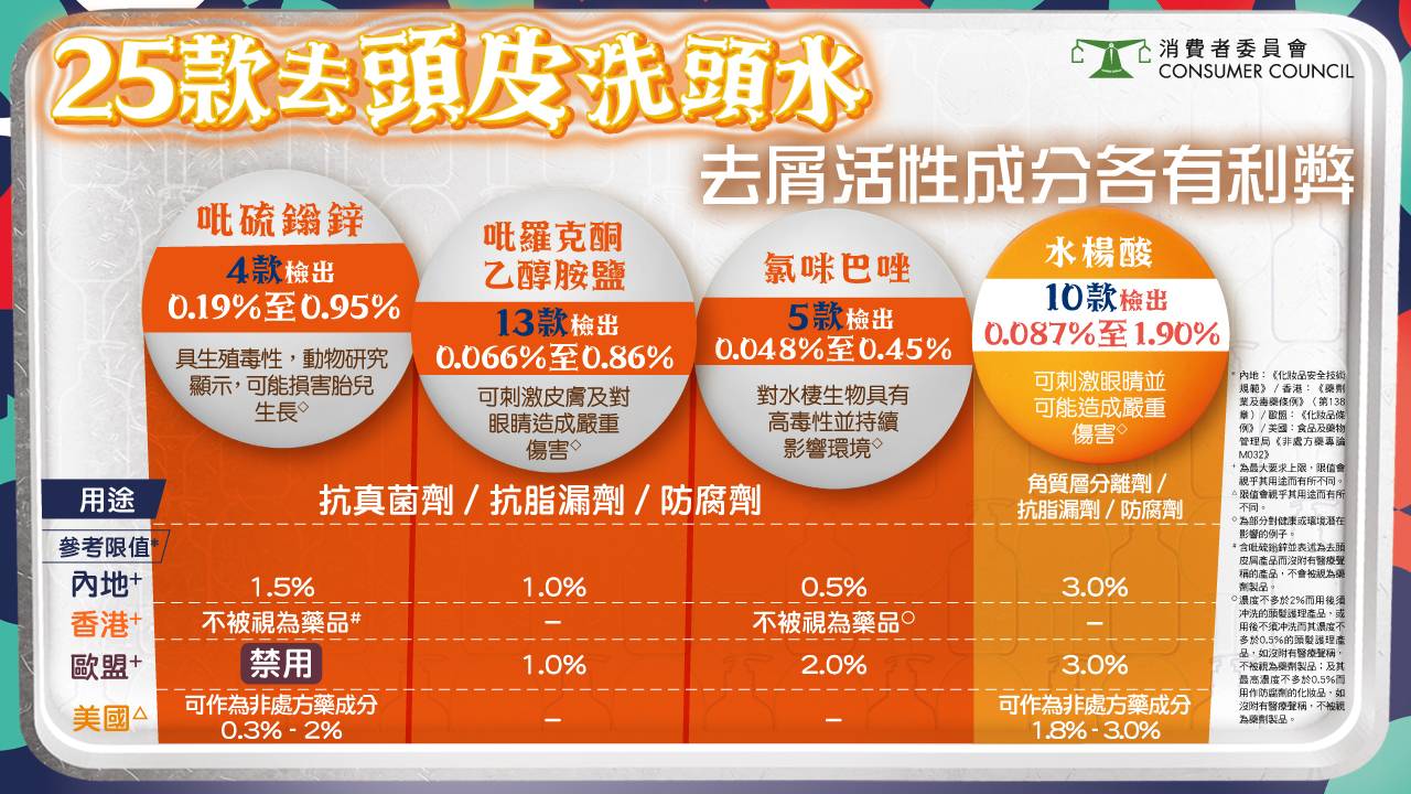 消費者委員會測試了市面上 25 款去頭皮洗頭水,發現當中 4 款含歐盟《化妝品條例》禁用、被美國視為准用的非處方藥用的「吡硫鎓鋅」及當中 9 成樣本有致敏物質,當中 13 款獲得 5 ⭐評級。消委會亦發現 25 款去頭皮洗頭水樣本當中,有不少都沒有標明不適合 3 歲以下兒童使用的標籤。報告當中也有指出市面上去頭皮洗頭水的價格差異等。如果有頭屑問題而常用這類產品的,要留心睇睇。