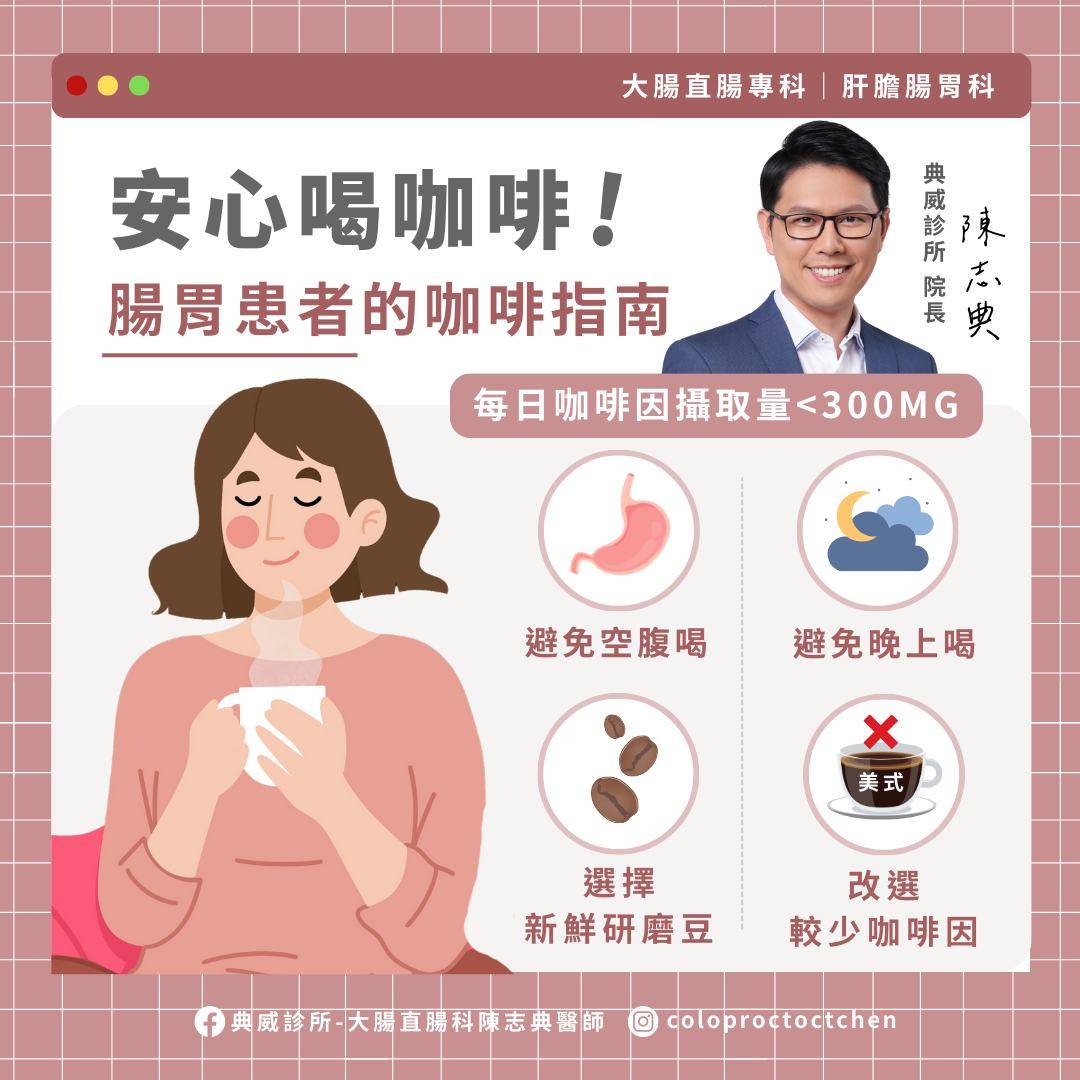 台灣大腸直腸科醫生陳志典早前在Facebook專頁發帖,表示很多人喜歡飲咖啡,卻擔心腸胃不適,尤其有胃食道逆流、胃酸過多或腸胃敏感的人士 ,但其實只要選對喝法,腸胃不佳的人也能享受到咖啡的美味。