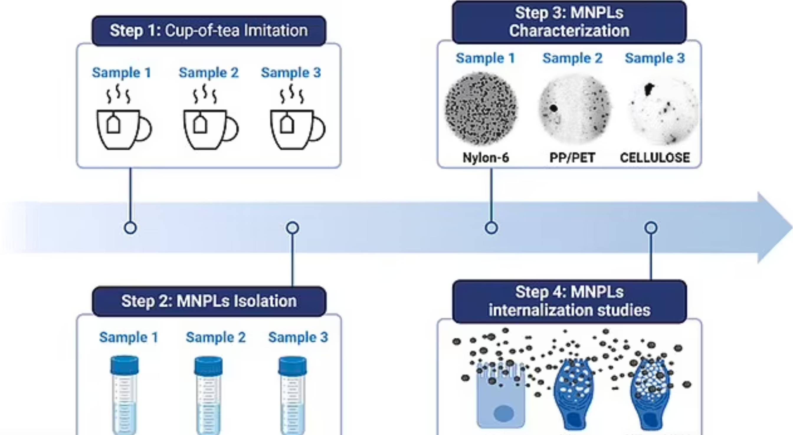 研究人員將300個茶包轉移到裝有600毫升、攝氏95度的水的1公升燒杯中,發現在3款茶包中,大量納米尺寸的顆粒釋放到水中,聚丙烯茶包的污染最嚴重,每毫升釋放約12億個顆粒,平均尺寸為136.7納米;尼龍茶包則每毫升釋出818萬個顆粒,平均尺寸為13.8.4納米。研究人員接著對微塑膠進行染色,然後將其暴露於不同類型的人類腸道細胞中,發現產生黏液的腸道細胞對塑膠的吸收量最高。