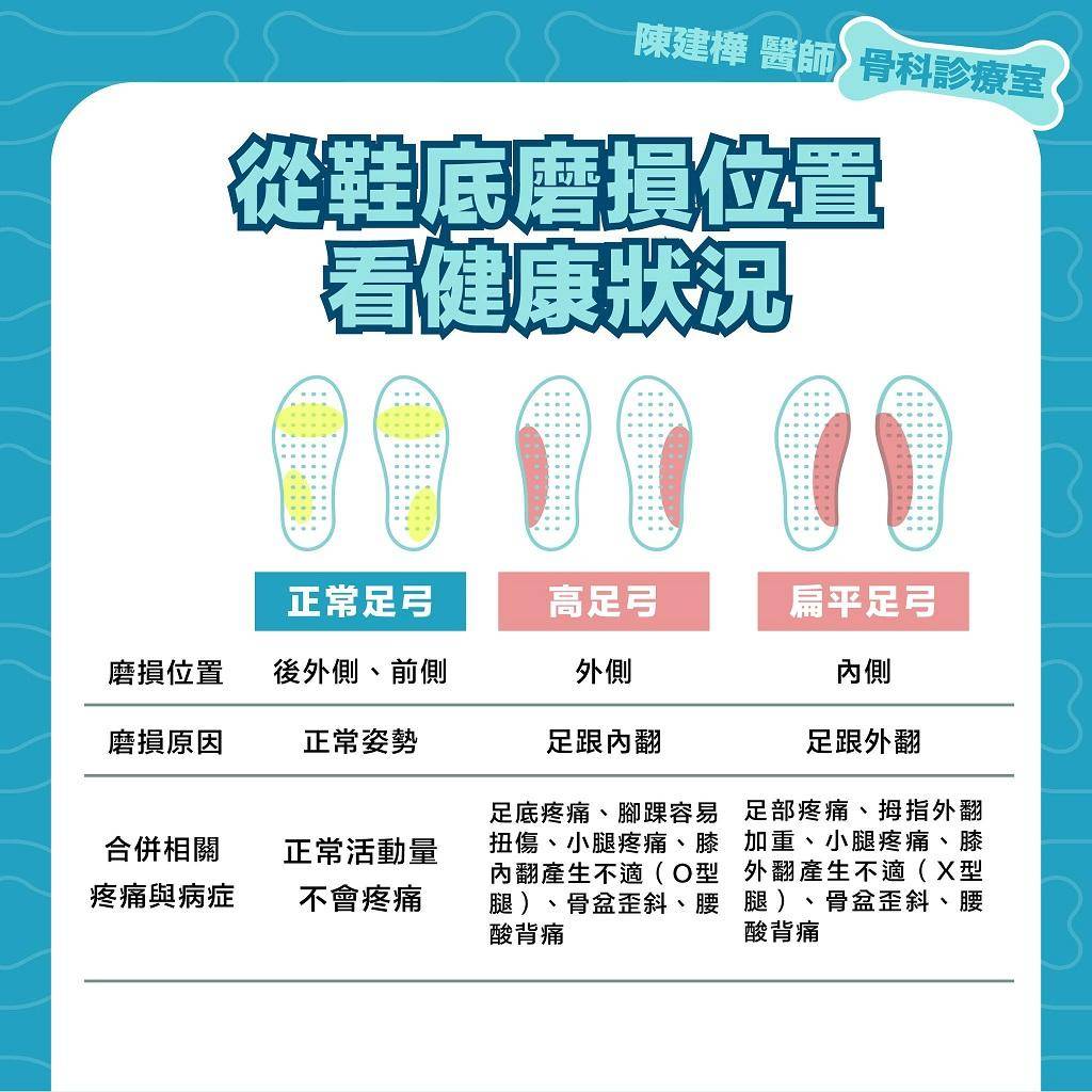 台灣萬芳醫院骨科部醫生陳建樺表示,鞋底磨損的位置可以反映一個人的步態和潛在健康問題。