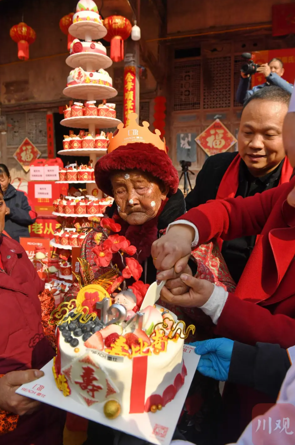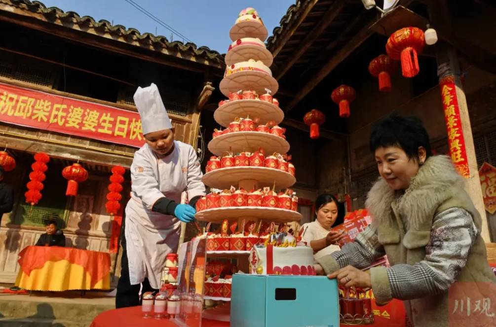 去年12月31日,邱柴氏老婦的家中熱鬧非凡,親友和熱心人士從各地趕來,為她慶祝124歲生日。她出生於1901年1月1日,2025年元旦是她的124歲生辰,主廚為她製作壽宴,南充雷仕愛心企業又為她客製化一個9層蛋糕。