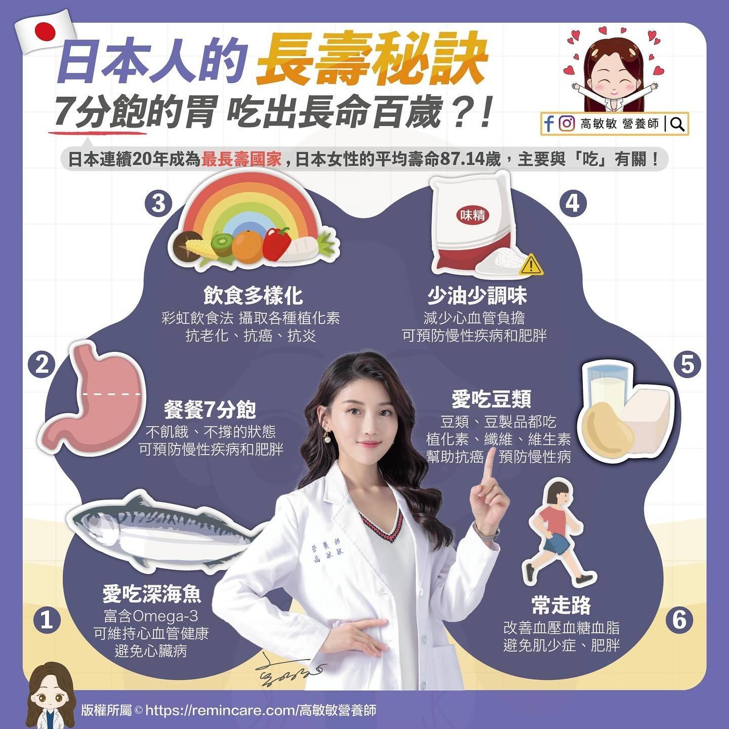 台灣營養師高敏敏日前在Facebook發文分享, 指日本女性平均壽命高達87.14歲,還是全世界肥胖率最低的國家。她最近去了一趟日本,發現日本人有以下6大長壽秘訣。