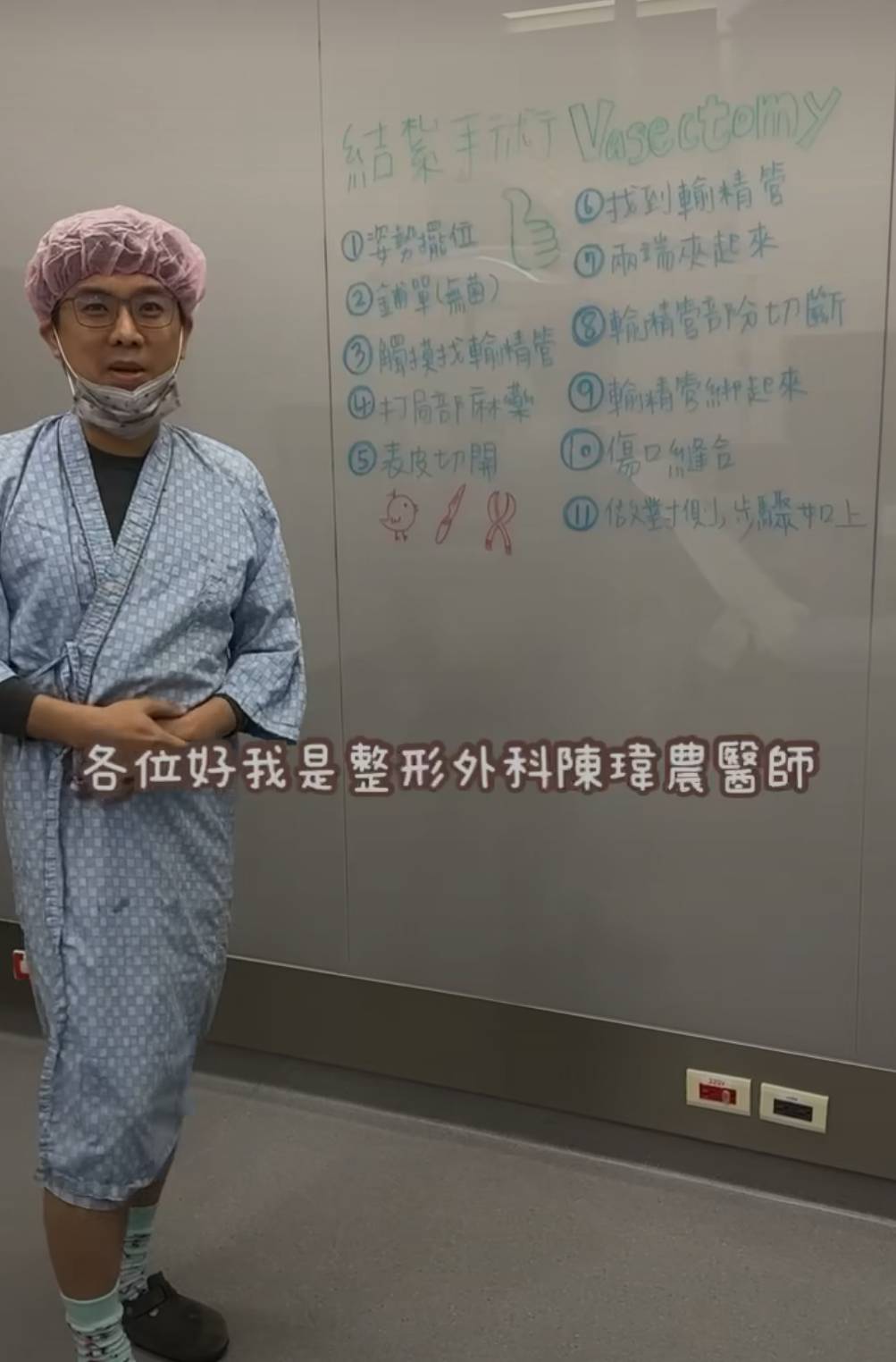 台灣整形外科醫生陳瑋農日前在Facebook以「自己幫自己結紮是甚麼體驗」為題發布一段短片。手術前他在白板詳列手術的10個步驟,包括姿勢擺位、鋪單(無菌)、觸摸找輸精管、打局部麻藥、表皮切開、找到輸精管、兩端夾起來、輸精管部分切斷、輸精管綁起來、傷口縫合。