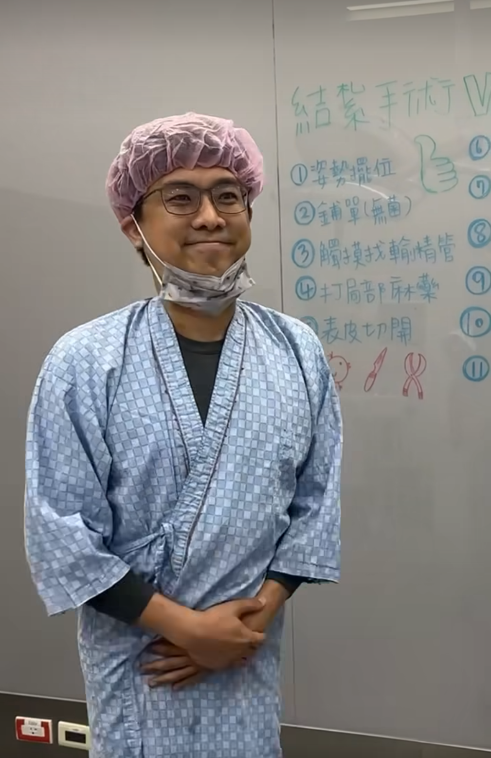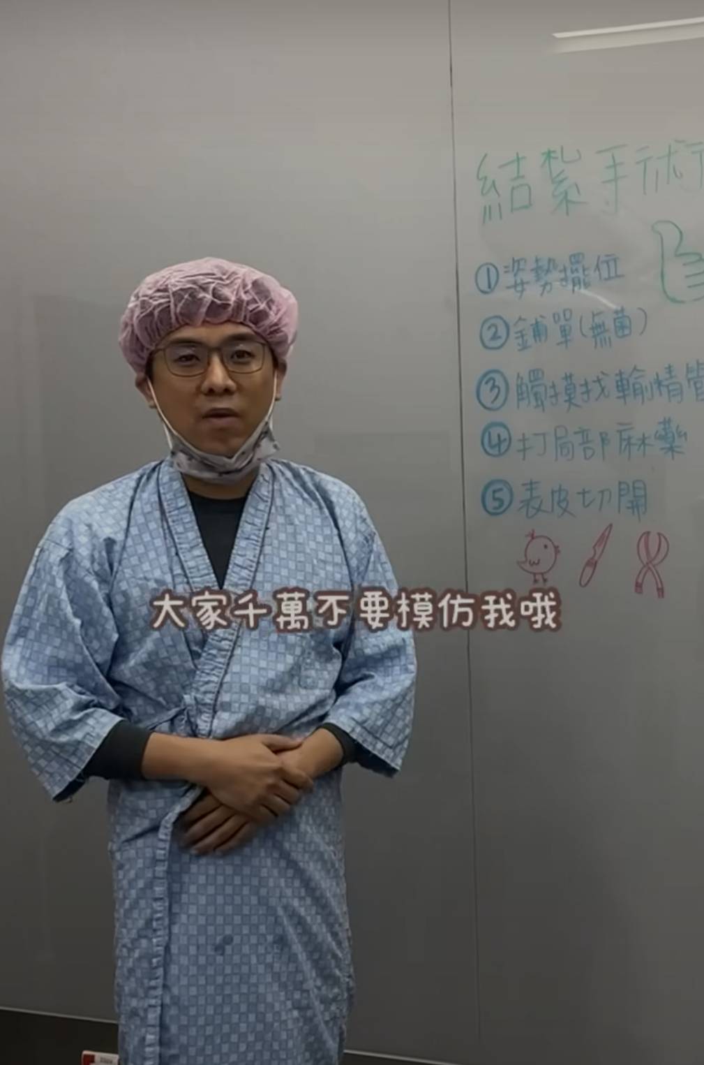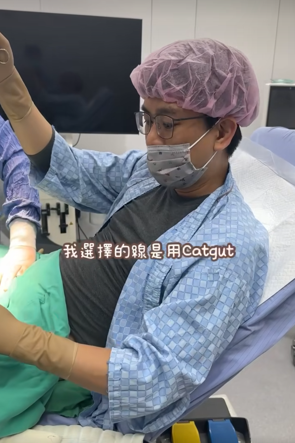 片中可見陳醫生低著頭往下體方向操刀,邊進行邊解釋結紮過程,縫合傷口部分都是他親手來,形容感覺很痠、很奇怪。他又分享翌日術後情況,形容手術當晚比較痛,翌日早上就無事。不過他提醒大家不要模仿,指在家自己做太危險,建議找專業泌尿科醫生比較安全,「因為我有3個小孩了,然後想說自己來試試看。很特別的體驗,不會有下次了」。