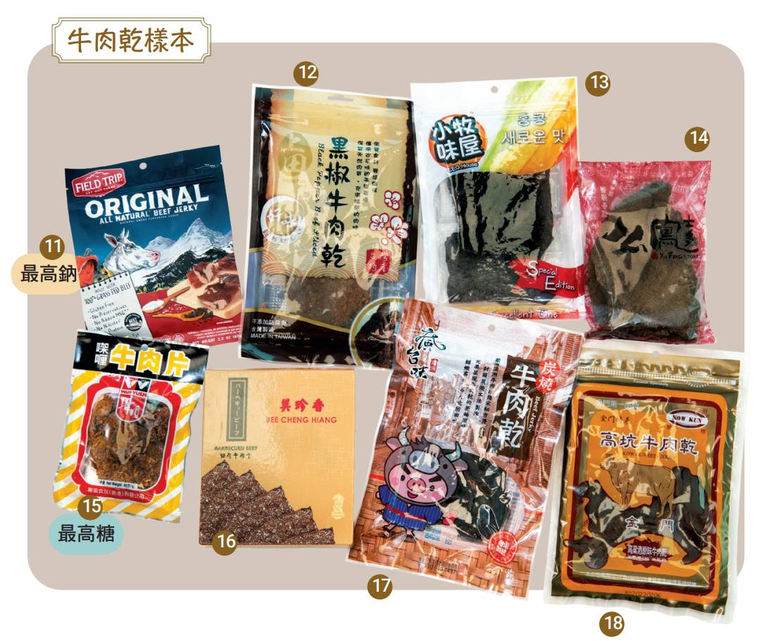測試結果顯示,13款樣本檢出多環芳香烴(PAHs),包括9款豬肉乾樣本,分別為「黑橋牌」、「快車肉乾」、「台畜」、「紹香園」、「冠華」、「759阿信屋」、「味脯」、「珍殿」和「山手作」,以及4款牛肉乾樣本,分別為「Field Trip」、「小牧味屋」、「華園」和「美珍香」,PAH4含量為每公斤0.6微克至18.2微克。當中,7款豬肉乾樣本以及2款牛肉乾樣本,檢出第一組致癌物苯並[a]芘,含量為每公斤0.5微克至1.9微克。「美珍香」盒裝牛肉乾的PAH4和苯並[a]芘含量均為最高,其PAH4的含量超出歐盟上限逾5成,而苯並[a]芘的含量亦非常接近歐盟上限。