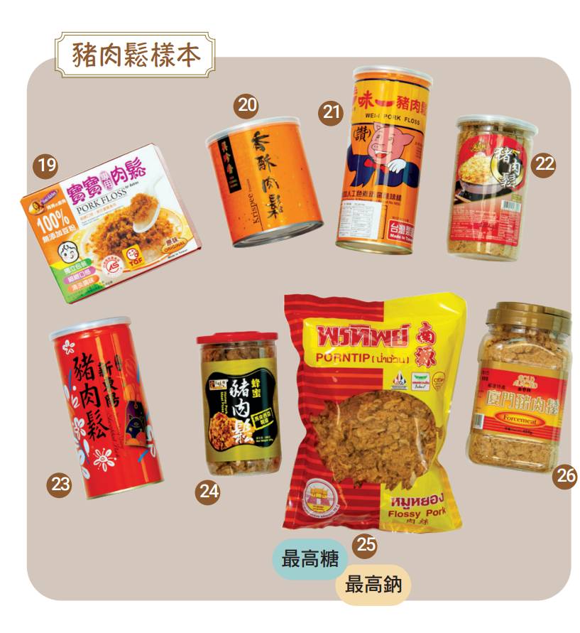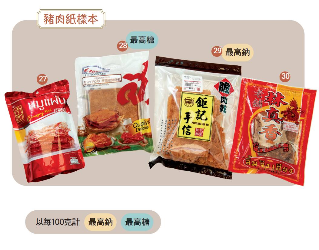 各樣本中,除了1款肉鬆樣本「媽媽的廚房」,其餘29款樣本均為高鈉食品,每100克樣本檢出的鈉含量由715毫克至1,900毫克。鈉含量最高的樣本為豬肉紙樣本「鉅記手信」,成年人進食1份100克所攝入的鈉(1,900毫克),已達世衞建議的鈉每日攝取上限95%,如再加上從日常膳食會攝入的鈉,估計該位成年人當日攝入的鈉會超出世衞建議的上限。