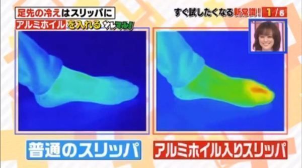 實際用儀器檢測,穿著普通拖鞋和穿著有錫紙的拖鞋相比,整個腳掌的溫度都顯著提升,溫差甚至相差攝氏8度。如擔心放錫紙後會引起搔癢,可多穿一層襪子。此外,這種做法不限於在家裡,也可將錫紙放入布鞋中。
