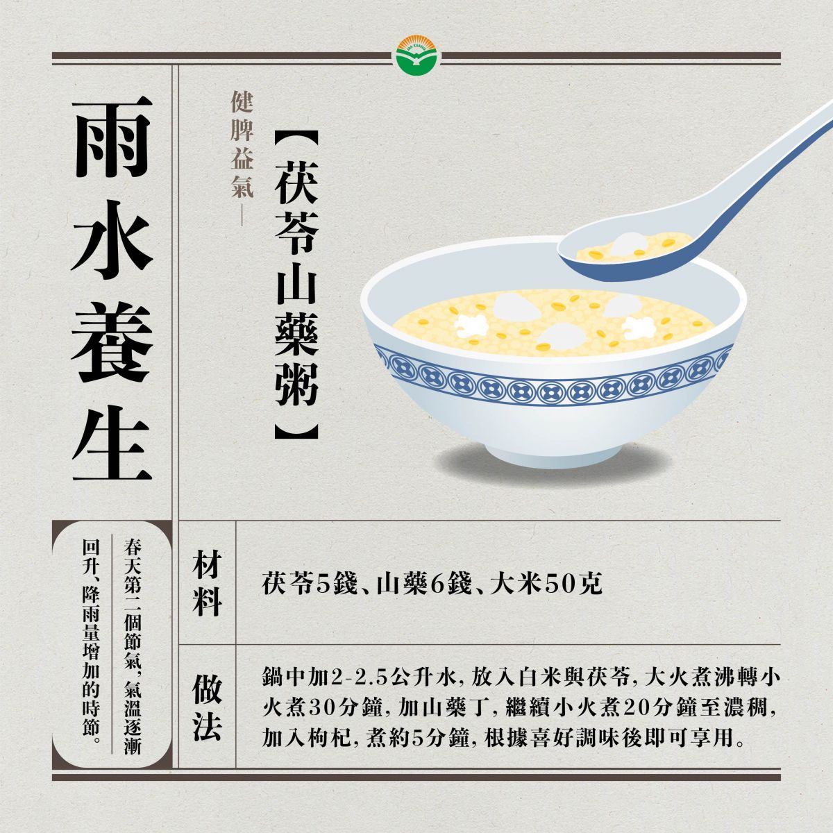 材料:白米¾至1杯、淮山6錢、茯苓5錢、枸杞1錢、水2,000至2,500毫升(可依個人喜好濃稠程度作調整)、冰糖或鹽依個人口味適量