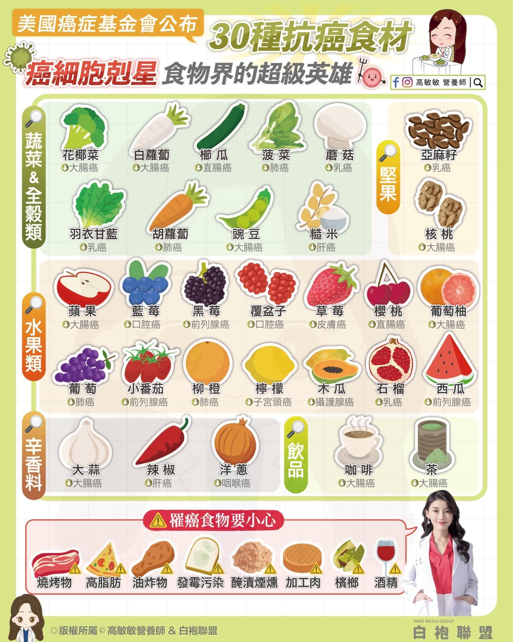 【抗癌/癌症】台灣營養師高敏敏在Facebook發文,指患癌人數一直居高不下,她便整理出美國癌症基金會公布的30種抗癌食材名單,提醒大家預防勝於治療,一起靠飲食對抗癌細胞。