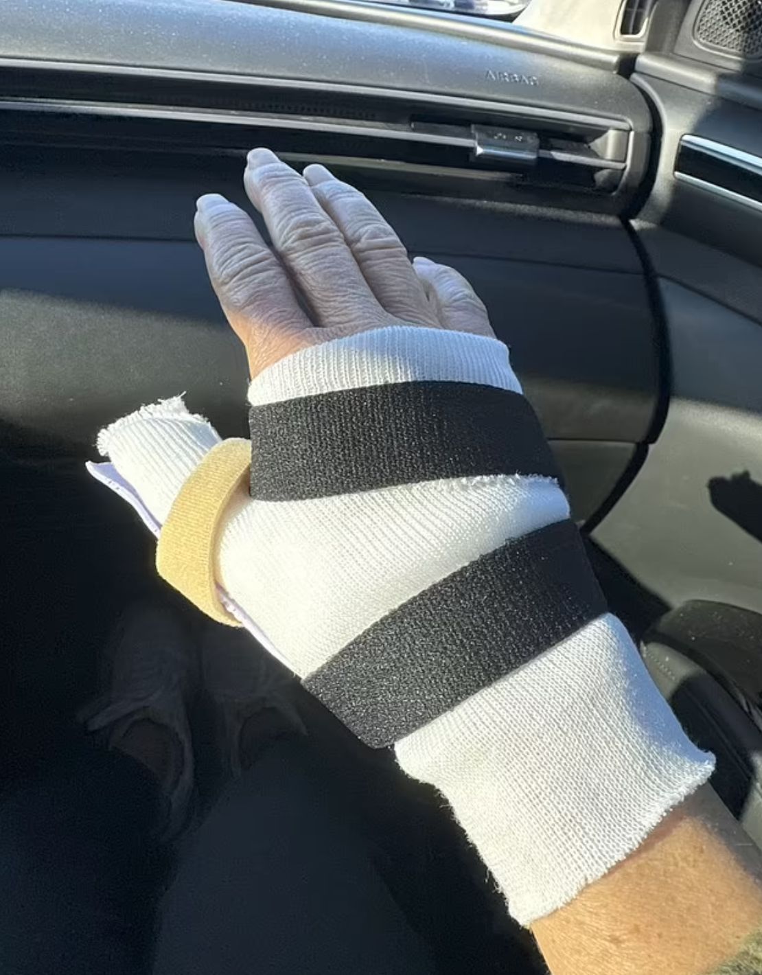 術後她的手邊留下一道長長的傷口和縫線,她解釋「皮膚科醫生看到我拇指指甲底部的變色,導致指甲上出現黑線的物質,是從指甲內部的生長板延伸出來。黑色素瘤就在我的拇指生長板裡,一直延伸到第一個指關節。他們不得不切掉這部分,因為切除黑色素瘤,骨頭和肌腱暴露在外,所以需要進行皮膚移植,把一些肉補回去,這次皮膚移植相當複雜。我以後再也不會有拇指指甲了,但如果我置之不理,我可能會失去拇指的指尖,甚至更糟。所以我很感激,而且恢復得還不錯」。