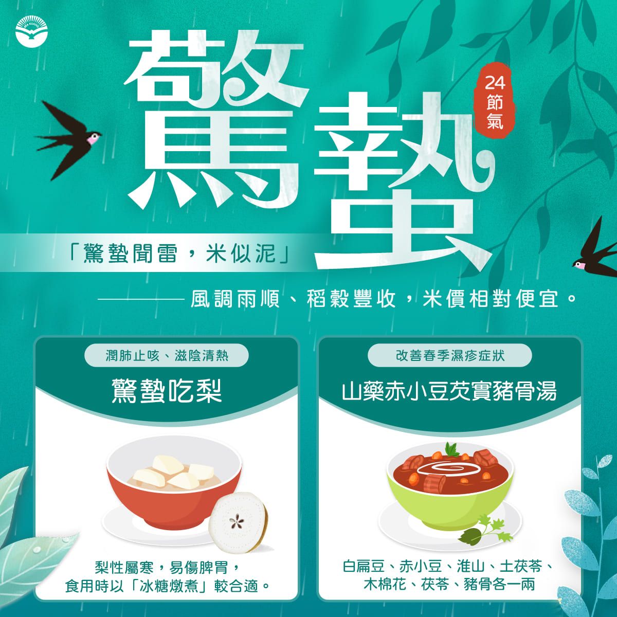 【驚蟄/養生/飲食/湯水/中醫】台灣中醫師王大元在Facebook發文,表示「驚蟄」(5日)是春雷初響的日子,蟄伏在泥土中的昆蟲準備甦醒,象徵一切萬物生意盎然。然而此時百花齊放和濕氣變重,花粉漫天飛舞,容易導致過敏性鼻炎和哮喘發作,因此要把口罩戴好。此外,病菌也蠢蠢欲動,像是輪狀病毒和腸病毒也會開始變多,加上濕度增加,也要多注意皮膚炎的發生。