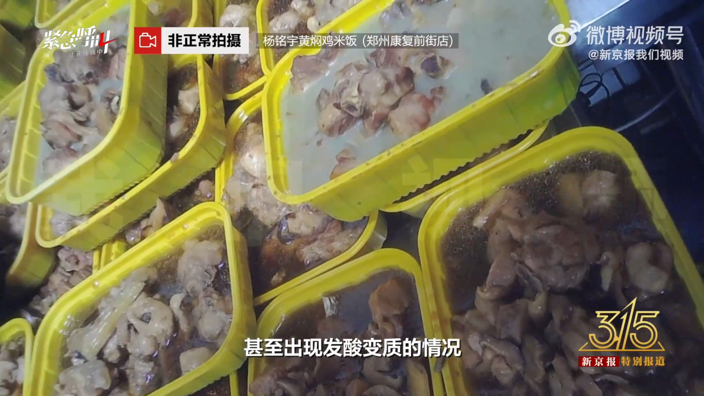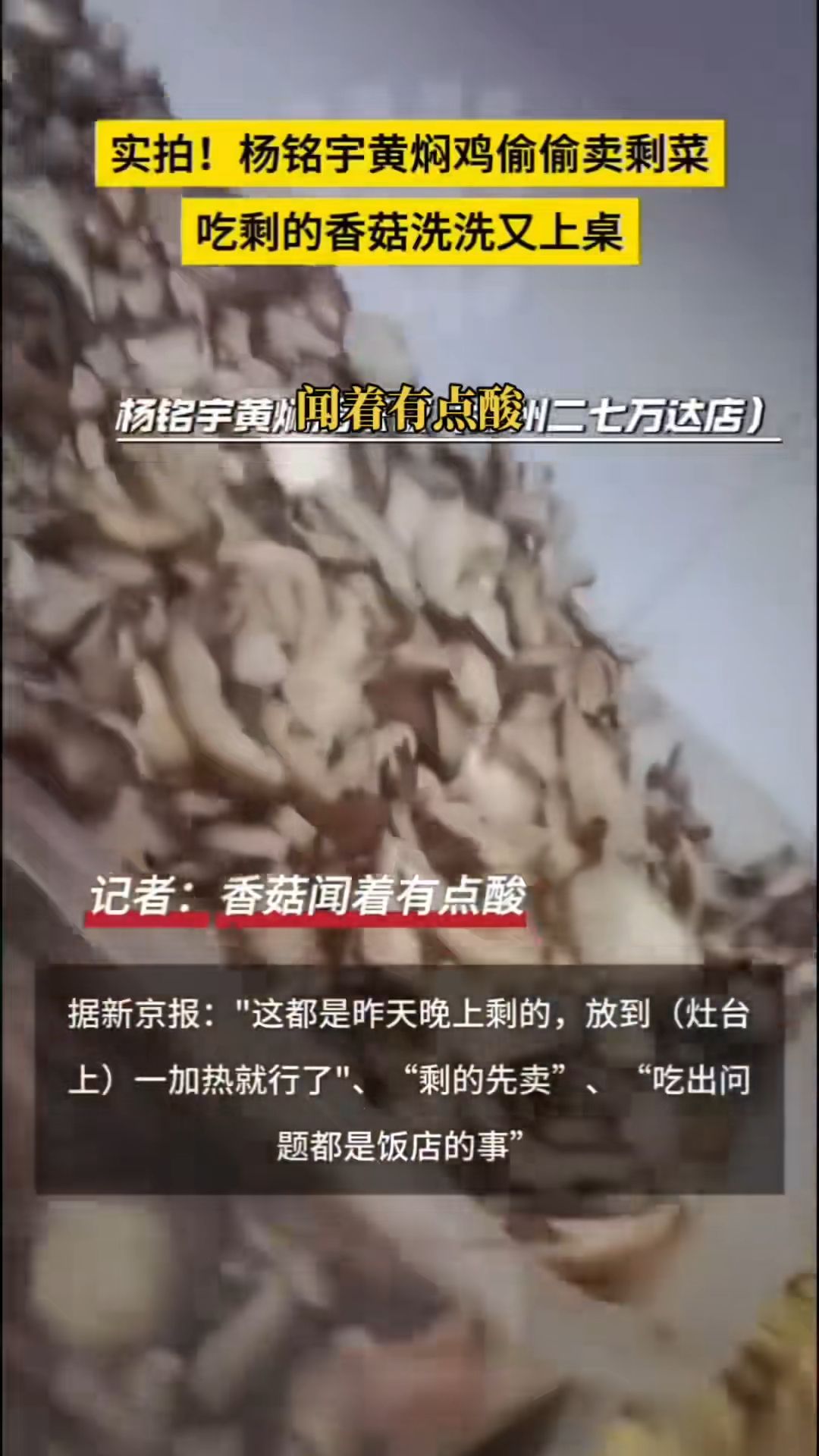 曾是「國民快餐」的楊銘宇黃燜雞米飯,如今門市數量急劇下降、食安問題頻傳。暗訪影片顯示,除了食材變質,楊銘宇黃燜雞米飯河南省鄭州市二七萬達店,還從顧客吃後的剩菜中挑出香菇等食材,進行「二次加工」,加上已經凝固的隔夜剩菜,再次賣給消費者。