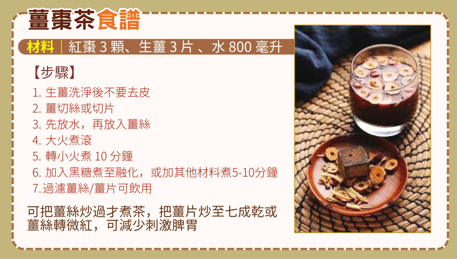 【中醫秘方/中醫食療/薑茶/薑棗茶/春夏養生/養生/中醫養生/養生飲品/立夏養生】春夏之間,天氣又濕又熱 ,令人易攰又易病,如果你入春之後經常有小感冒、濕重易攰或是久咳不癒,中醫一個春夏養生飲品——薑棗茶可能會幫到你!最佳飲用時機由立夏(2025年5月5日 )開始,有助你補陽氣、暖胃袪濕、冬病夏治。本文就有國家一級營養師蘭心教你煮薑茶的秘技、更有8個薑棗茶食譜。