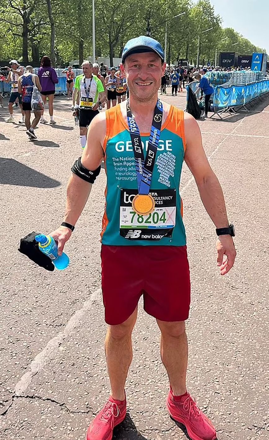 【抗癌/症狀/宿醉/腦瘤/潛伏/馬拉松/勵志/腦腫瘤/癌症/腦癌/手術】綜合外媒報道,來自英國約克郡瑟斯克的41歲男子George Wade在去年4月被診斷出患有2個腦瘤後需要重新學行,令人鼓舞的是,他在不到1年內以3小時16分鐘完成倫敦馬拉松。