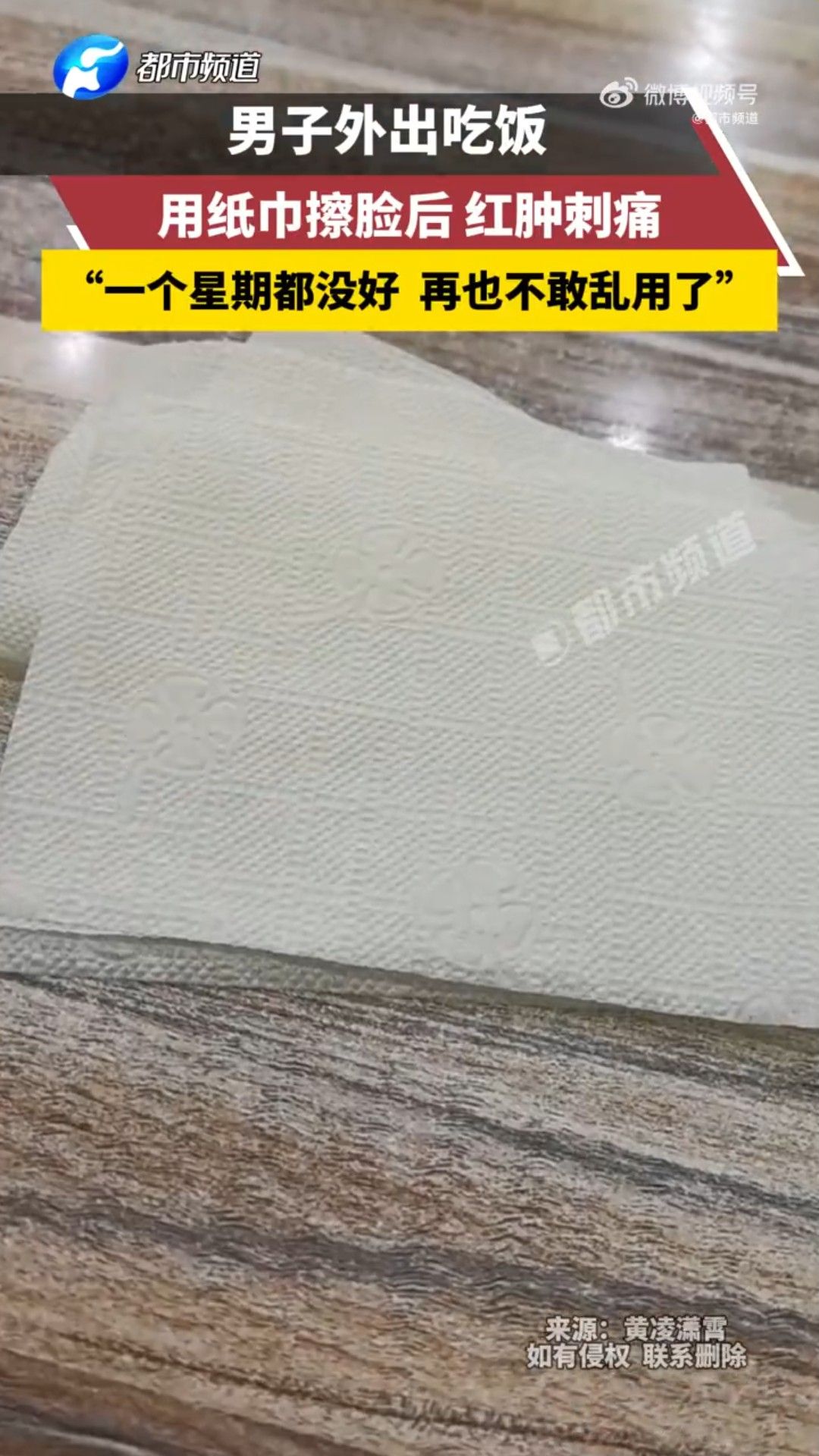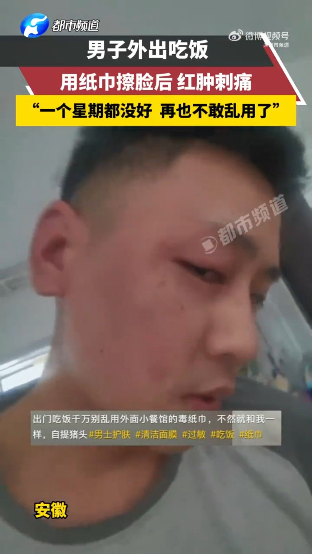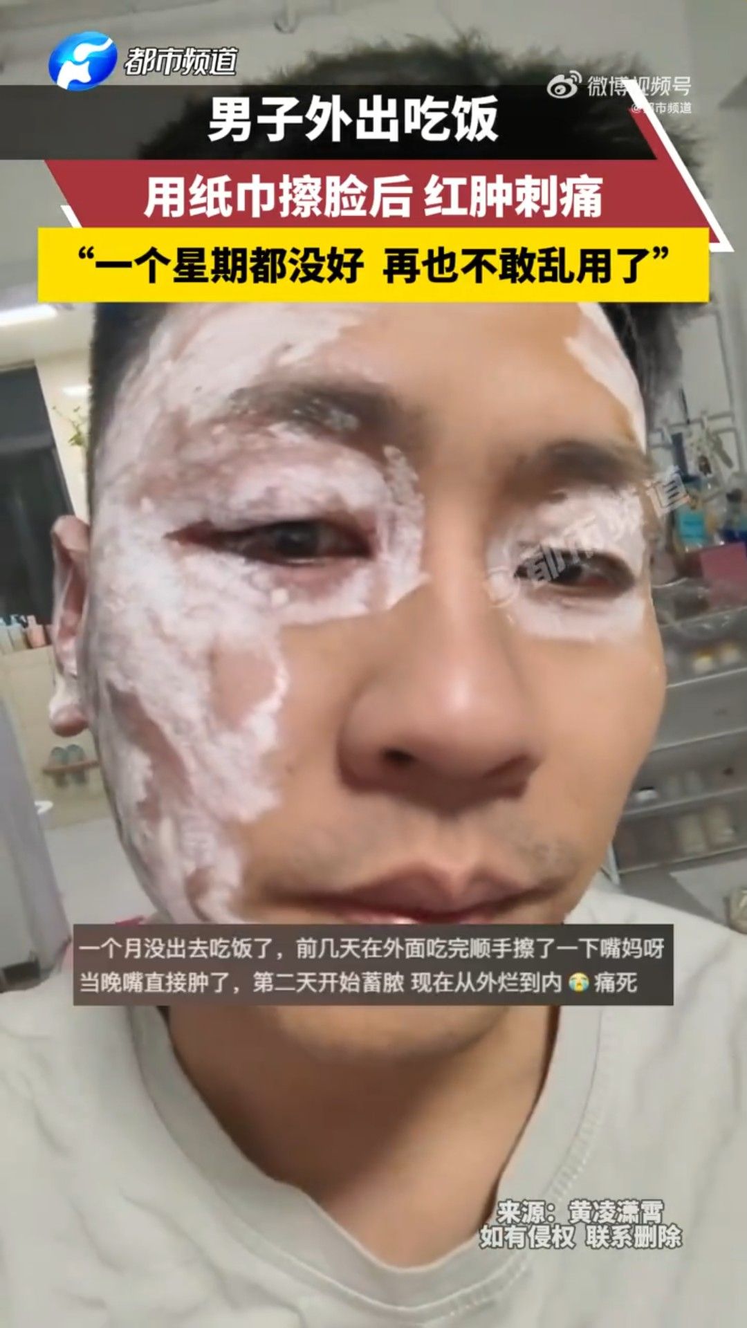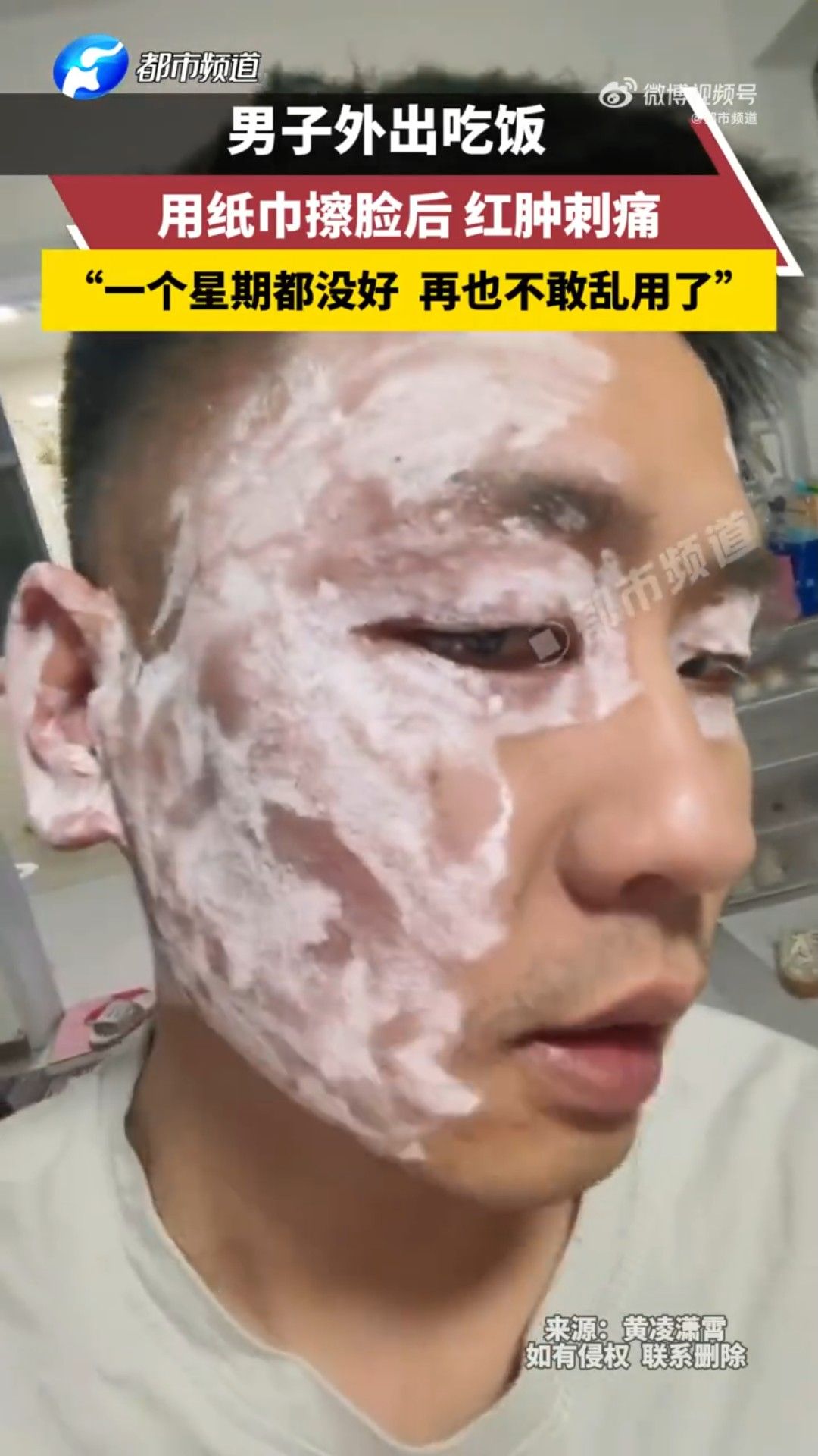 【有毒/紙巾/餐廳/抹汗/紅腫/毀容/醫生/劣質】綜合內媒報道,安徽一名男子近日在路邊一間餐廳吃麻辣燙時,因流汗隨手拿餐桌上的紙巾擦臉。