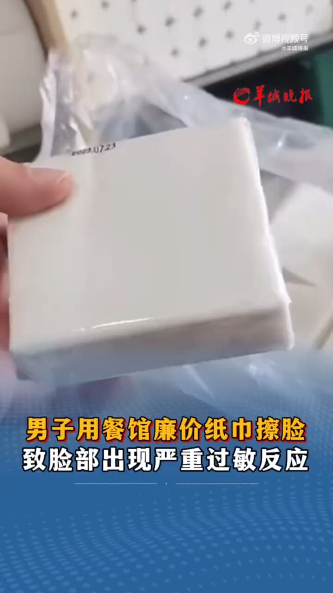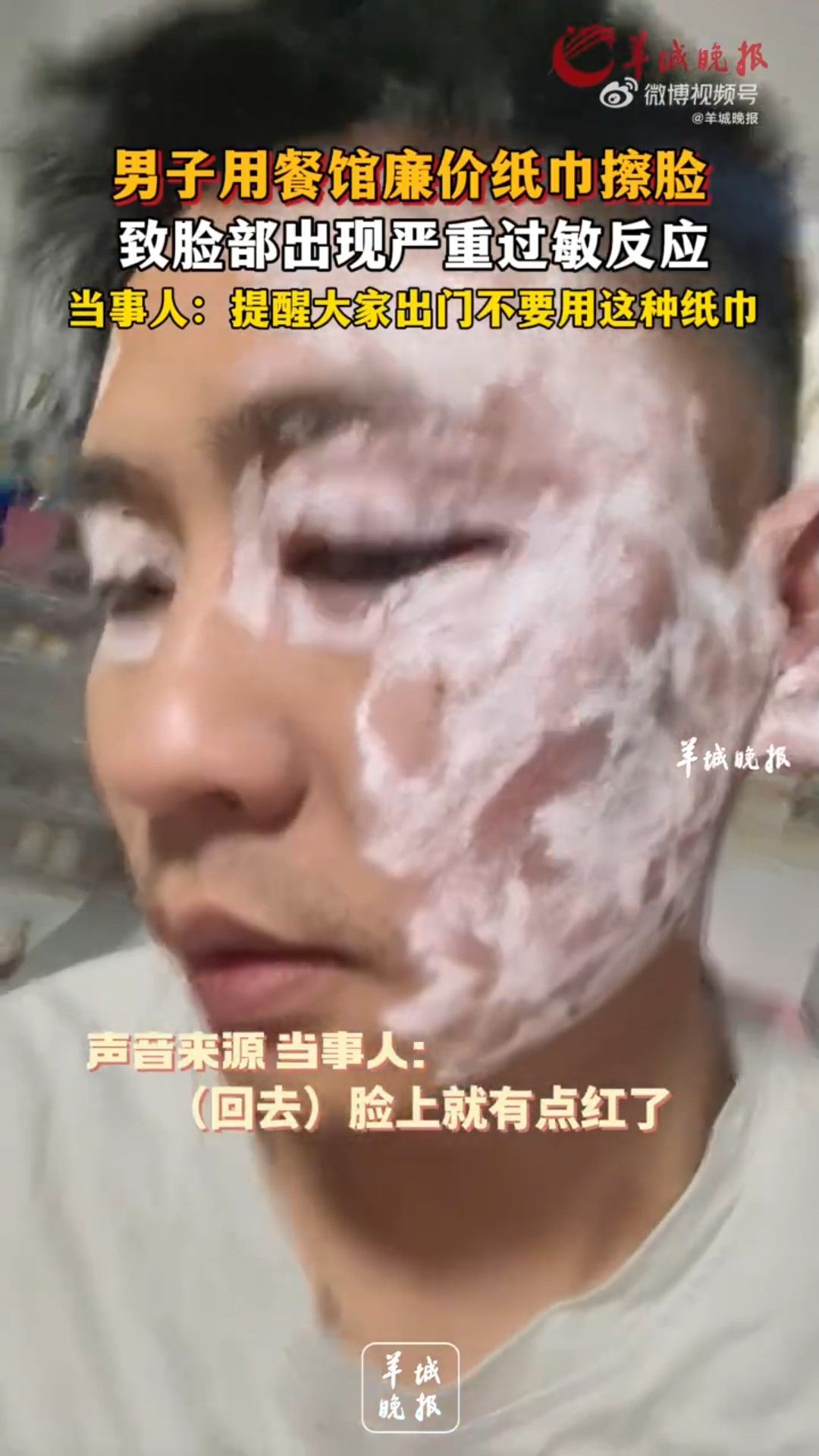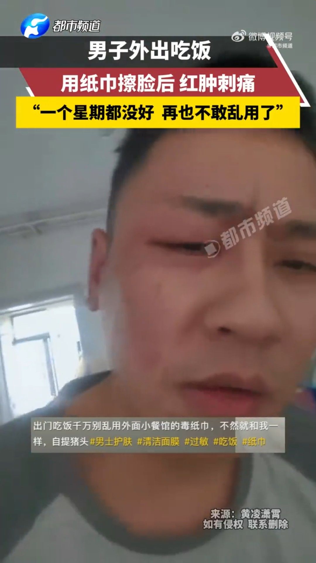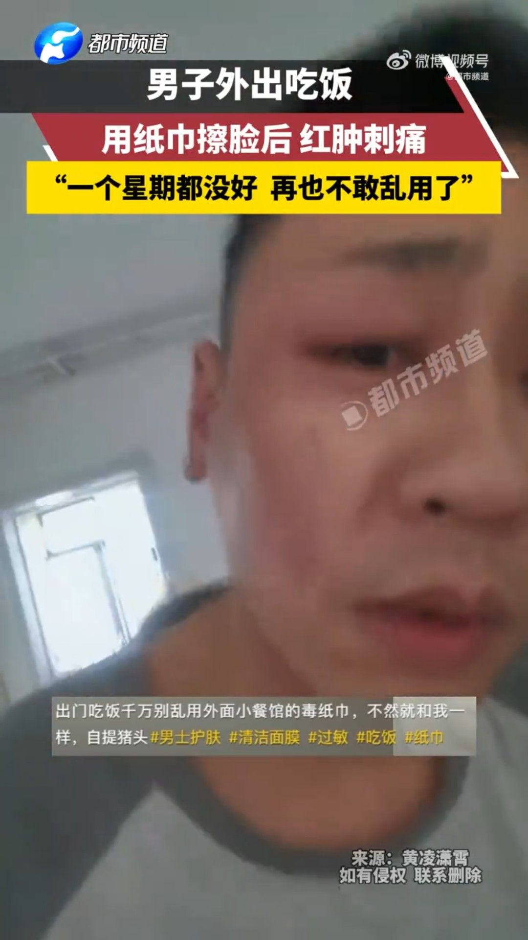 【有毒/紙巾/餐廳/抹汗/紅腫/毀容/醫生/劣質】綜合內媒報道,安徽一名男子近日在路邊一間餐廳吃麻辣燙時,因流汗隨手拿餐桌上的紙巾擦臉。