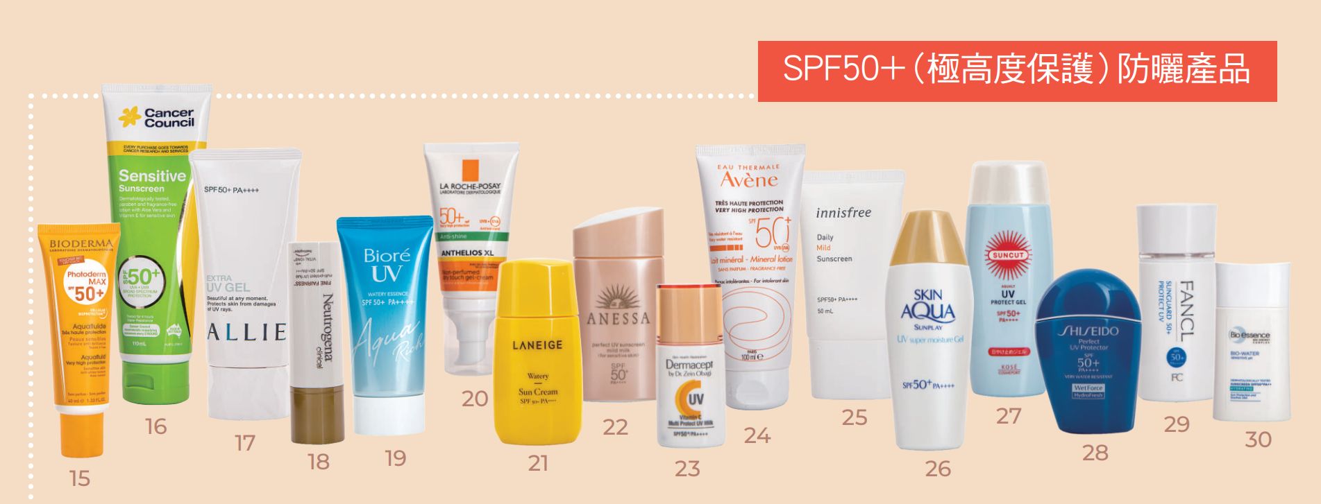 消委會早前從個人護理店、百貨公司、化妝品零售店等地方搜集30款適合日常面部使用的防曬產品,當中14款標示之SPF系數為30至50,屬高度保護的防曬產品;另外16款標示之SPF系數為50+,屬極高度保護的防曬產品。樣本價錢由$80至$550不等,每克或毫升則由$0.7至$16.1。是次測試的樣本全部屬乳液狀,當中11款聲稱具防水功能。