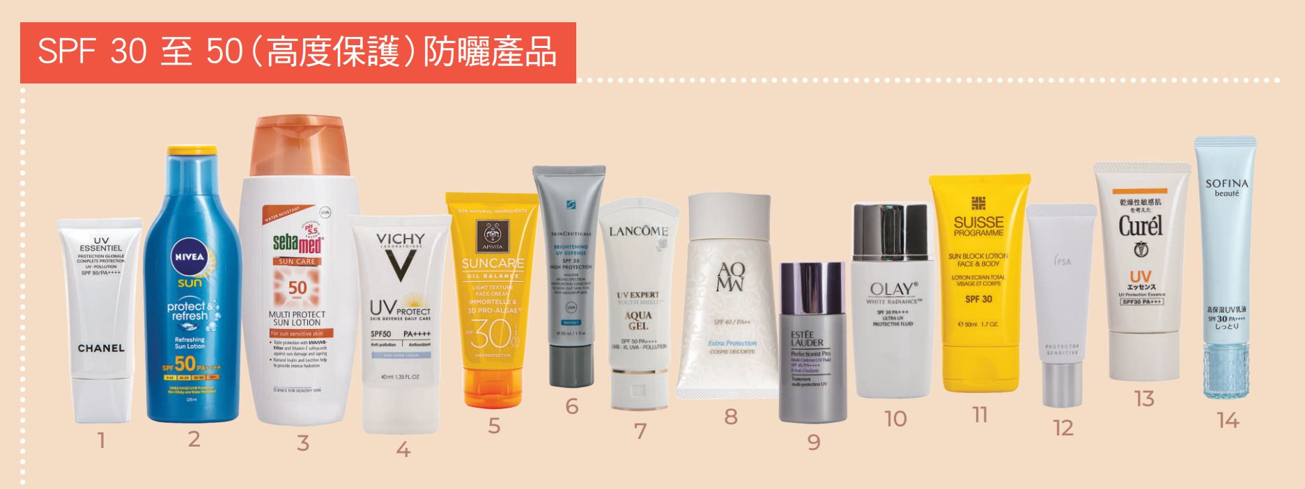 14款屬高度保護的防曬產品標示的SPF值介乎30至50,結果發現只有6款量得的SPF值高於或等於產品上的標示值,包括「Chanel」SPF50、「Nivea」SPF50、「Seba Med」SPF50、「Vichy」SPF50、「SkinCeuticals」SPF30和「Olay」SPF30。