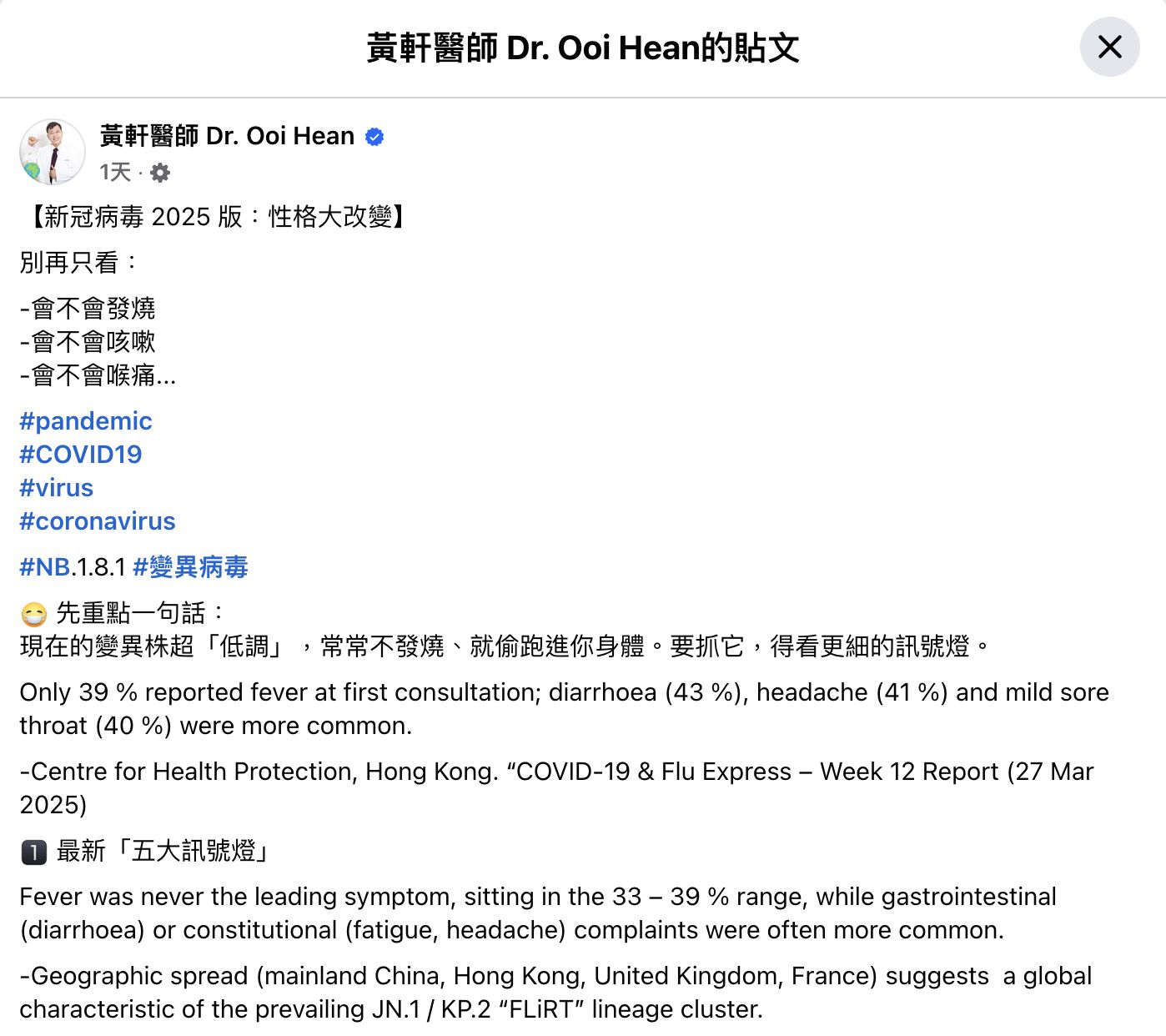 台灣胸腔暨重症醫師黃軒在其Facebook指出,2025年版新冠病毒「改玩『潛行』模式」,不少患者根本沒發燒,僅出現輕微腹瀉、疲倦、咳嗽等感冒般小症狀,等到發現時,肺部可能早已出現毛玻璃病變。因為病狀「輕微」,不少人照返工及聚會,致傳播風險更高。
