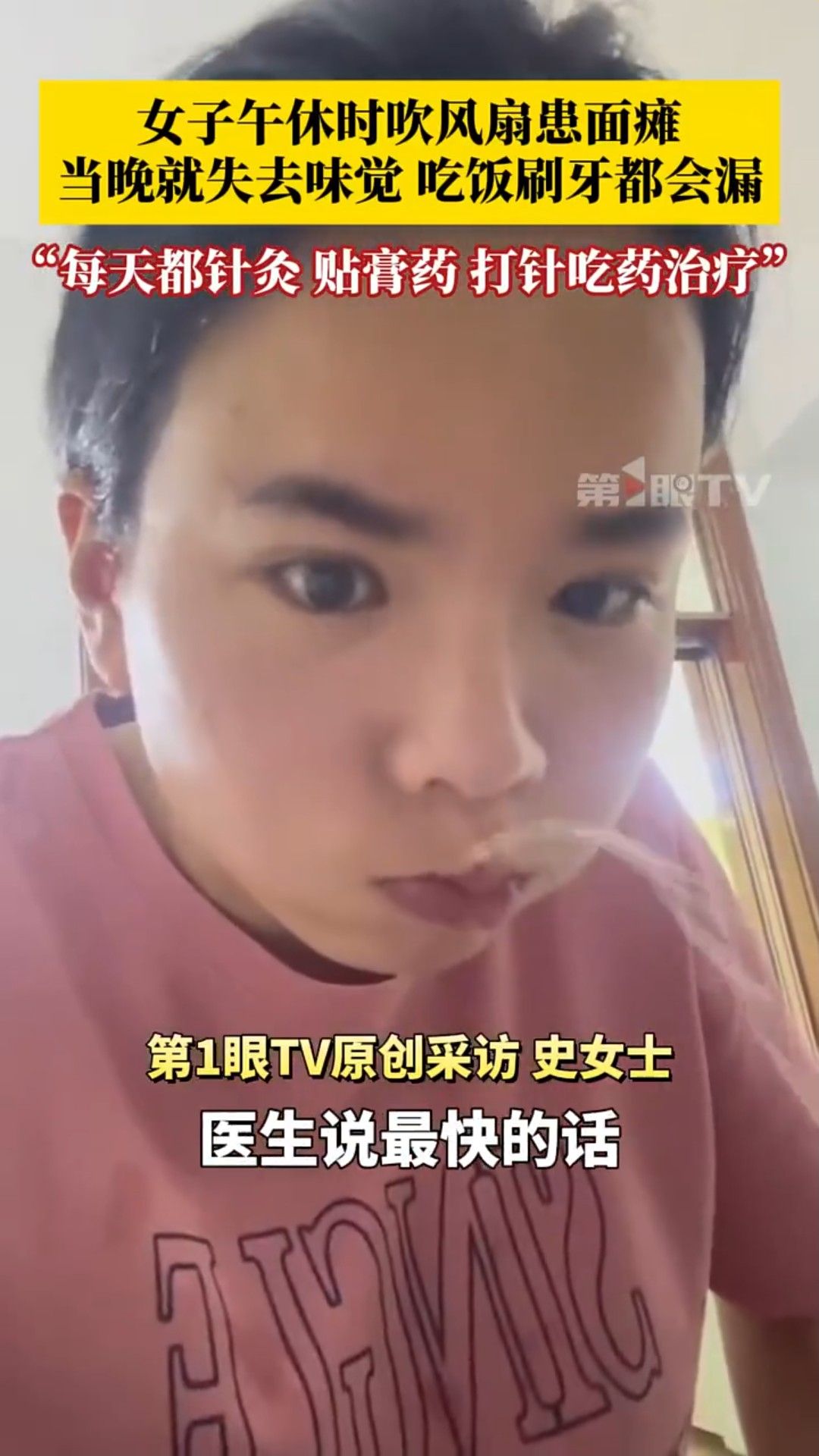 【風扇/危機/午睡/吹風扇/面癱/健康/乘涼】綜合內媒報道,內地一名25歲的史姓女子透露,有日午休時開啟電風扇的「掃風功能」,大約吹了3、4小時後,醒來發現嘴巴不受控地往右歪,而且閉不上右眼,翌日睡醒後症狀更加嚴重,出現口歪眼斜,醫院檢查結果為面癱。