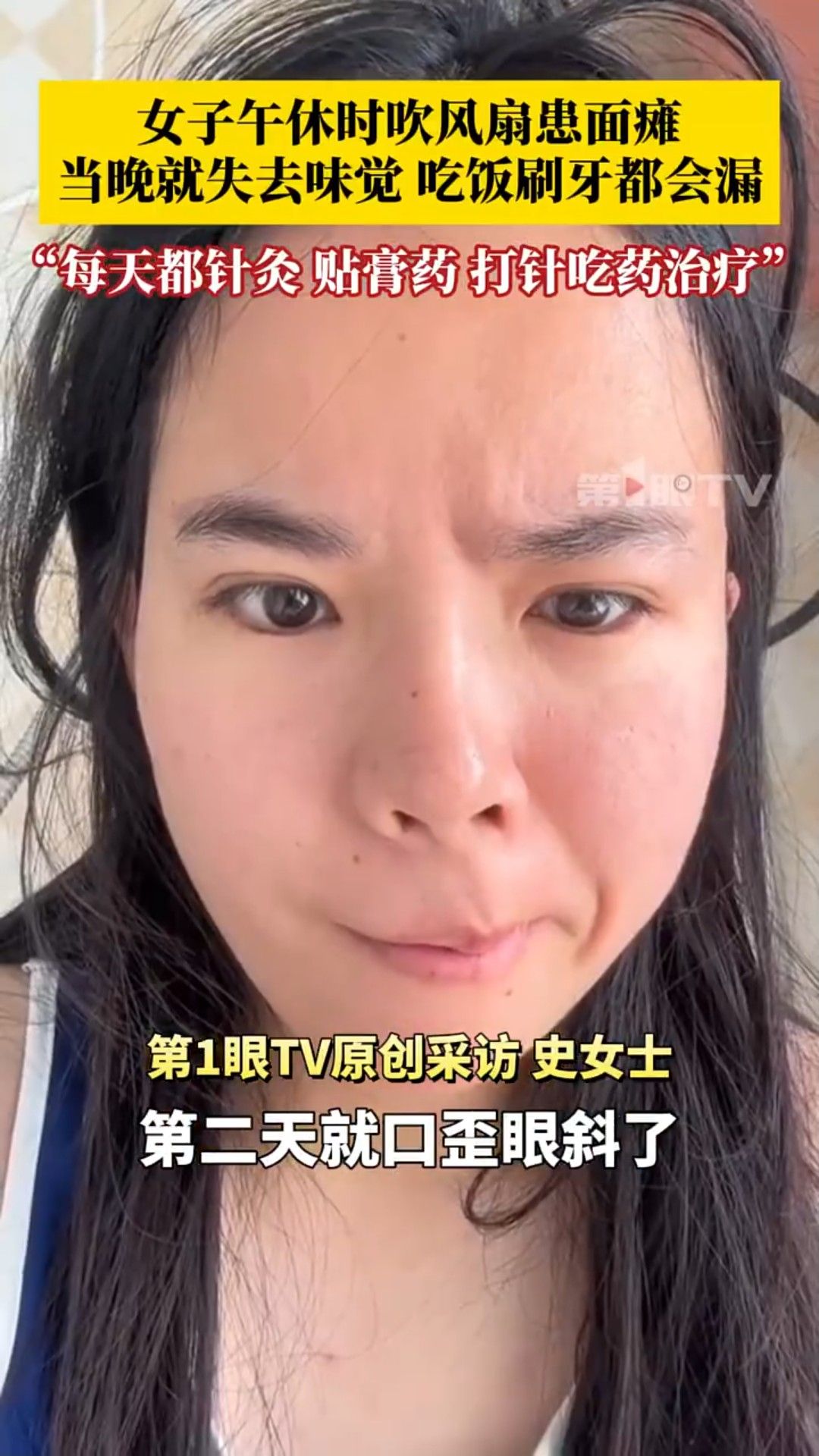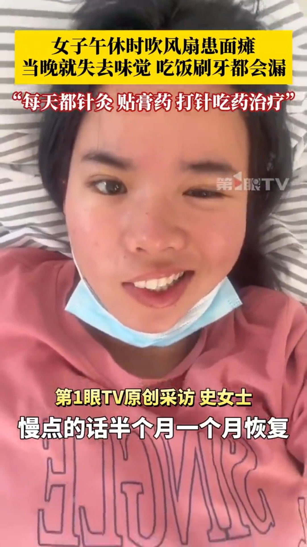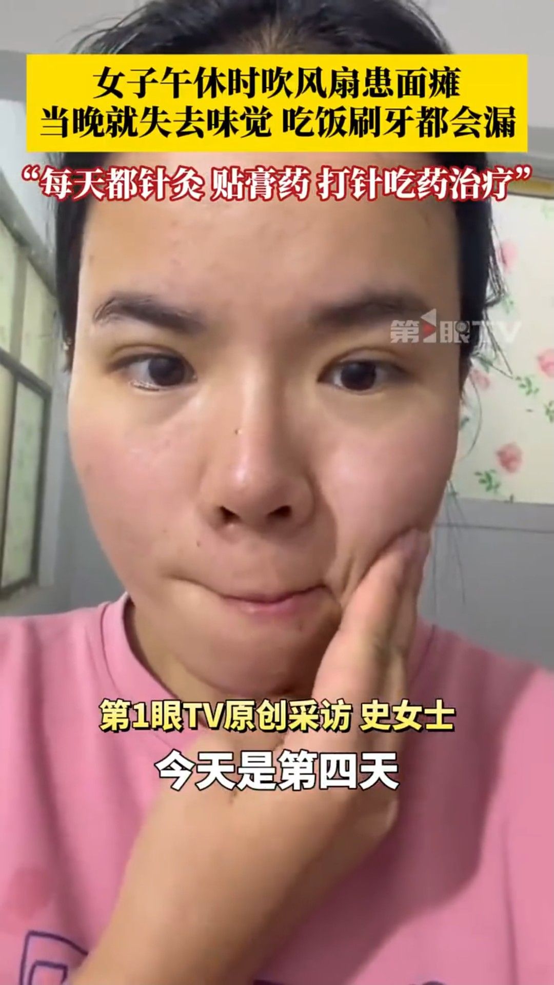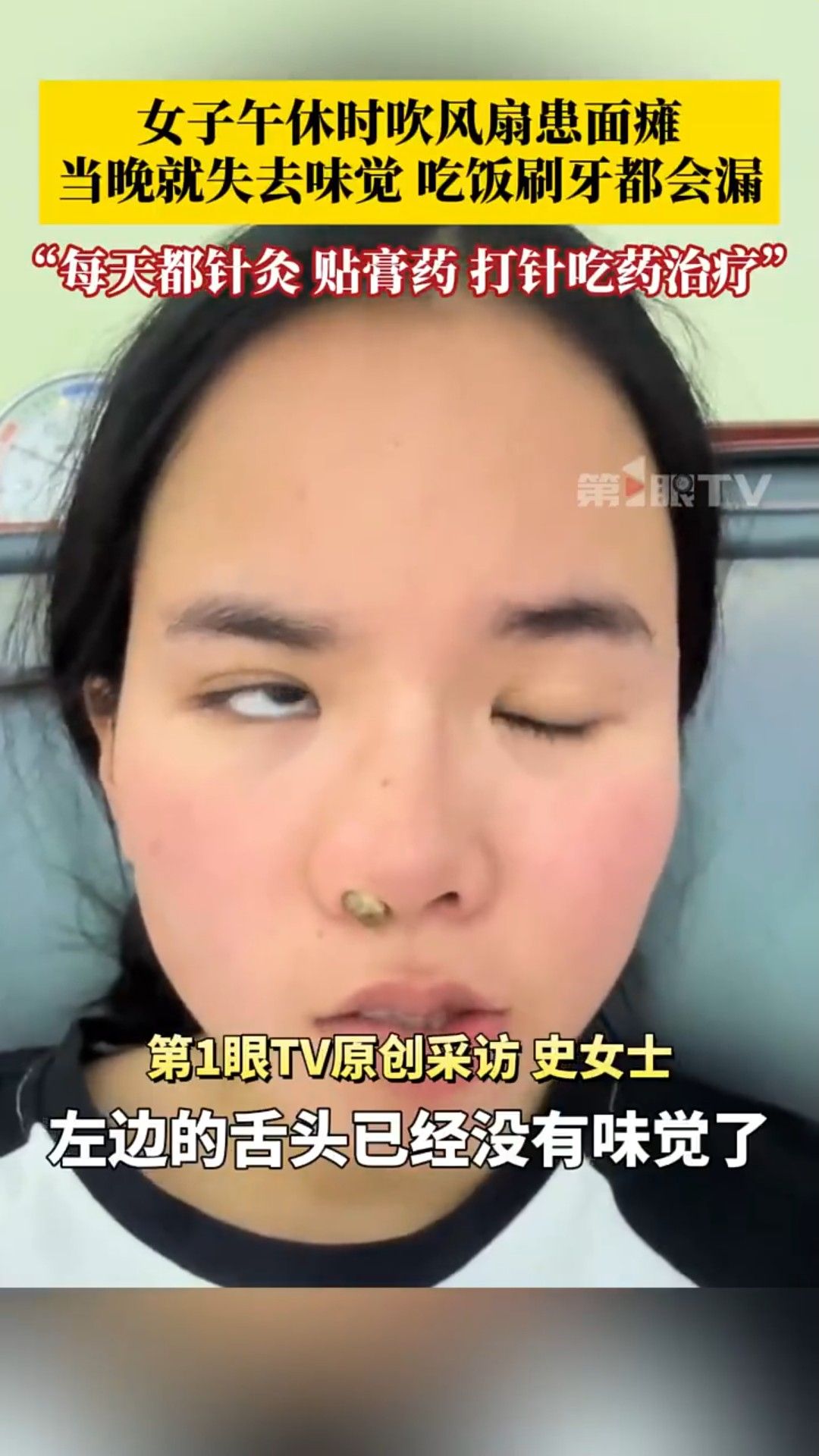 事後她接受針灸治療,同時貼膏藥、服藥等,惟治療期間她喝水、吃飯和漱口都較費力,形容「經常會漏水、漏飯,一半臉不受控制」。