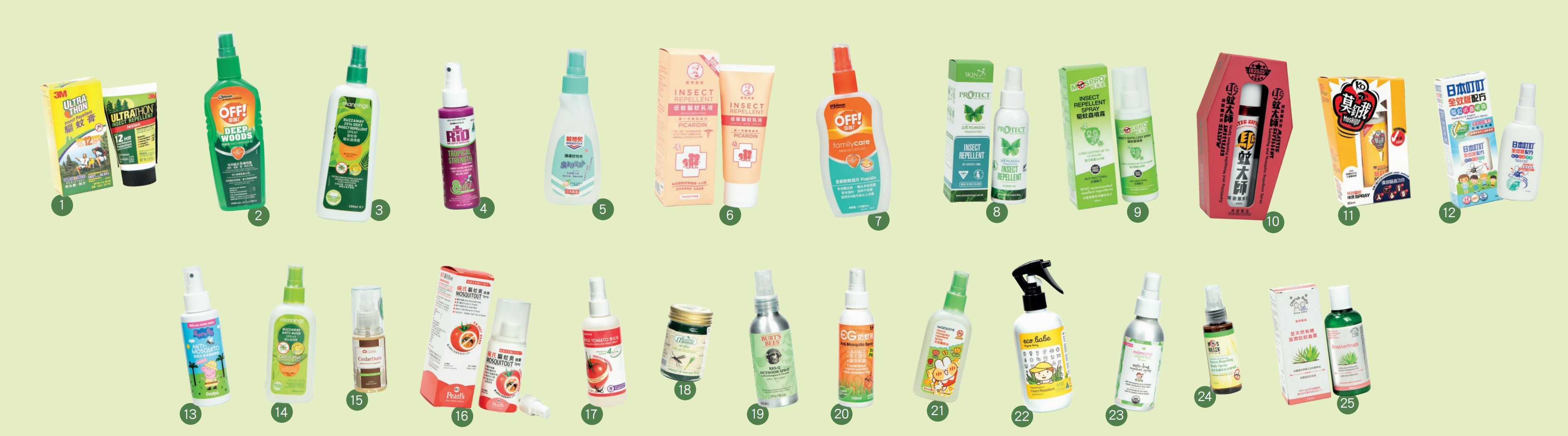 消委會在不同零售點包括個人護理用品店、超市、百貨公司和嬰兒用品店等選購25款驅蚊劑,當中包括5款標示含有避蚊胺(DEET)、4款標示含有派卡瑞丁(picaridin或icaridin)、2款標示含有丁基乙酰氨基丙酸乙酯(IR3535)、3款標示含對-薄荷烷-3,8-二醇(PMD)、1款標示含有雪松油(cedar oil)、2款標示含有野紅茄提取物,還有其他8款聲稱「天然」或「草本」的樣本,標示含有植物成分,當中較多樣本標示的物質為香茅。