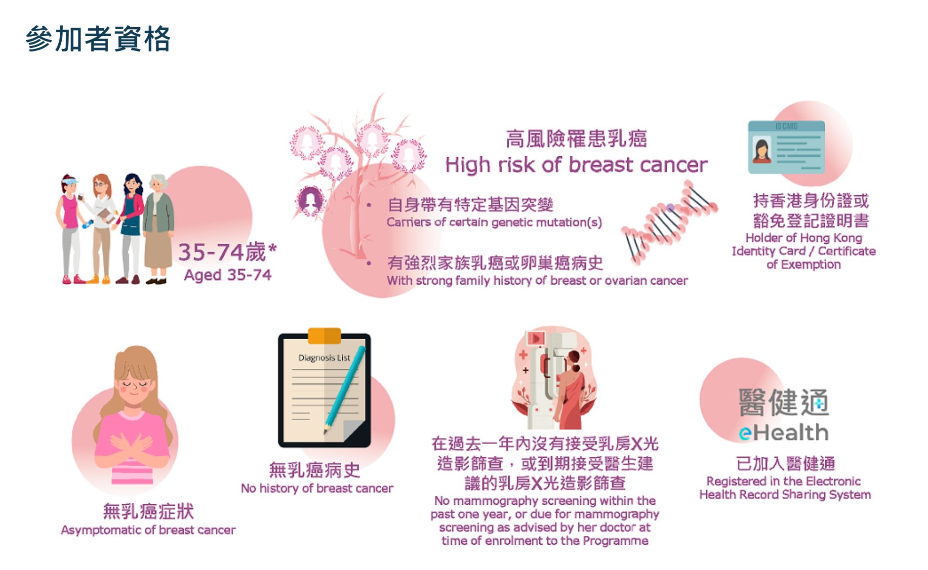 1. 年滿35至74歲的婦女。如有家族乳癌或卵巢癌病史的婦女,則可按家族中最年輕的確診年齡提早10年開始篩查(但不早於30歲)