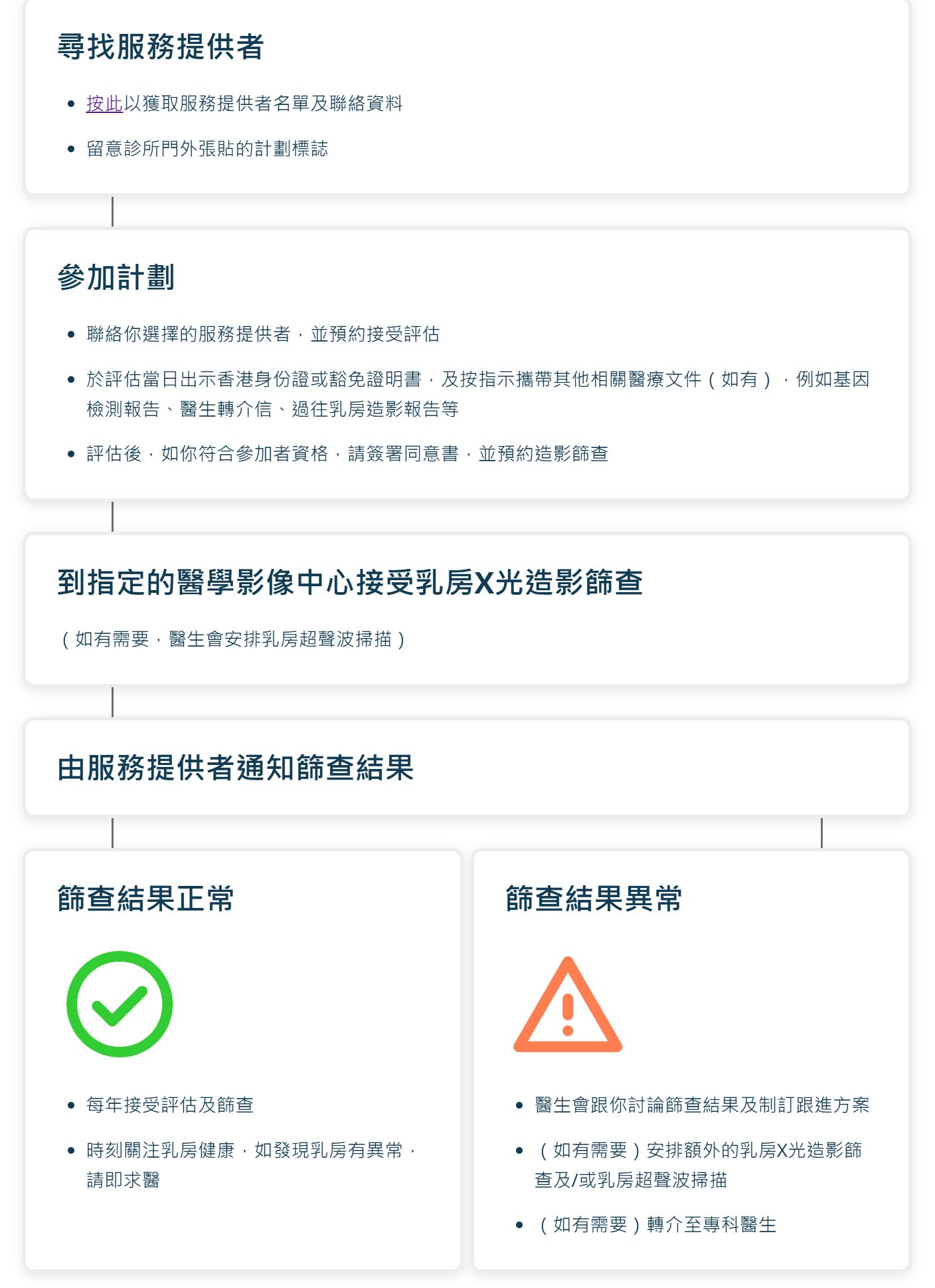 合資格婦女可由今日(30日)起,聯絡3間非政府組織的指定診所預約評估,並安排在6月10日或之後接受乳房X光造影檢查。另外,確定帶有特定基因突變的人士,將額外獲安排接受超聲波乳房檢查。
