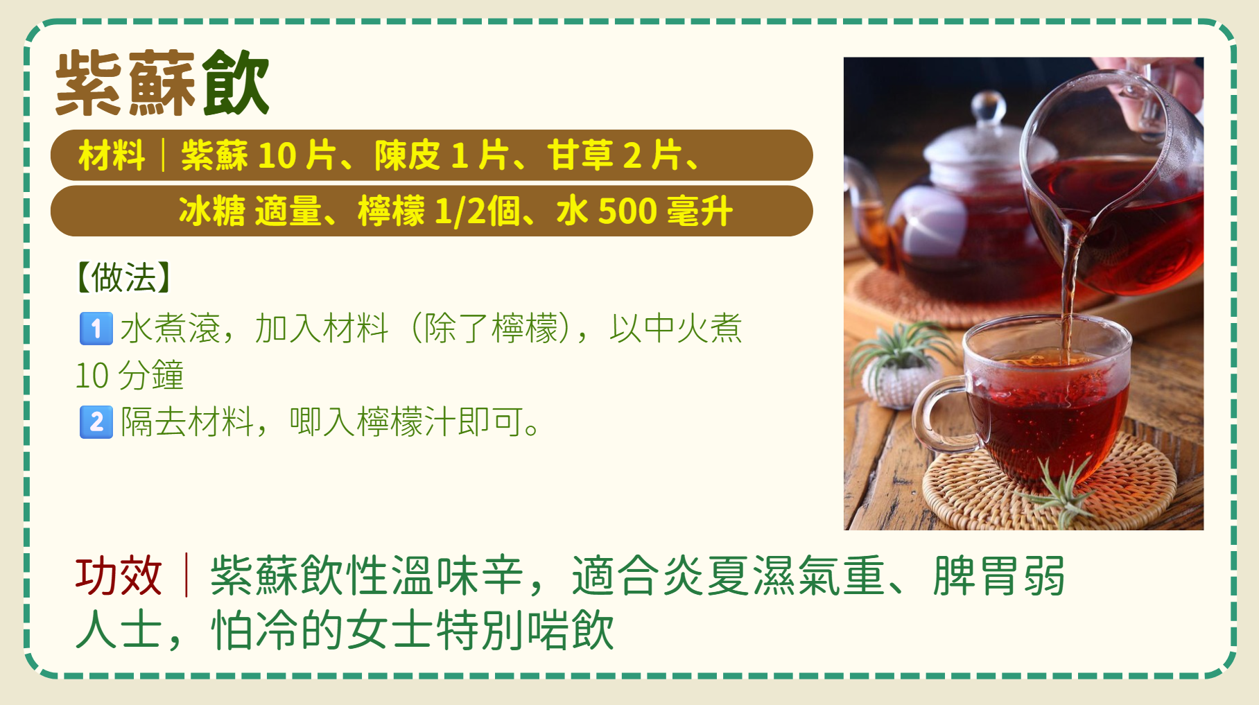 💡功效|紫蘇飲性溫味辛,適合炎夏濕氣重、脾胃弱人士,怕冷的女士特別啱飲