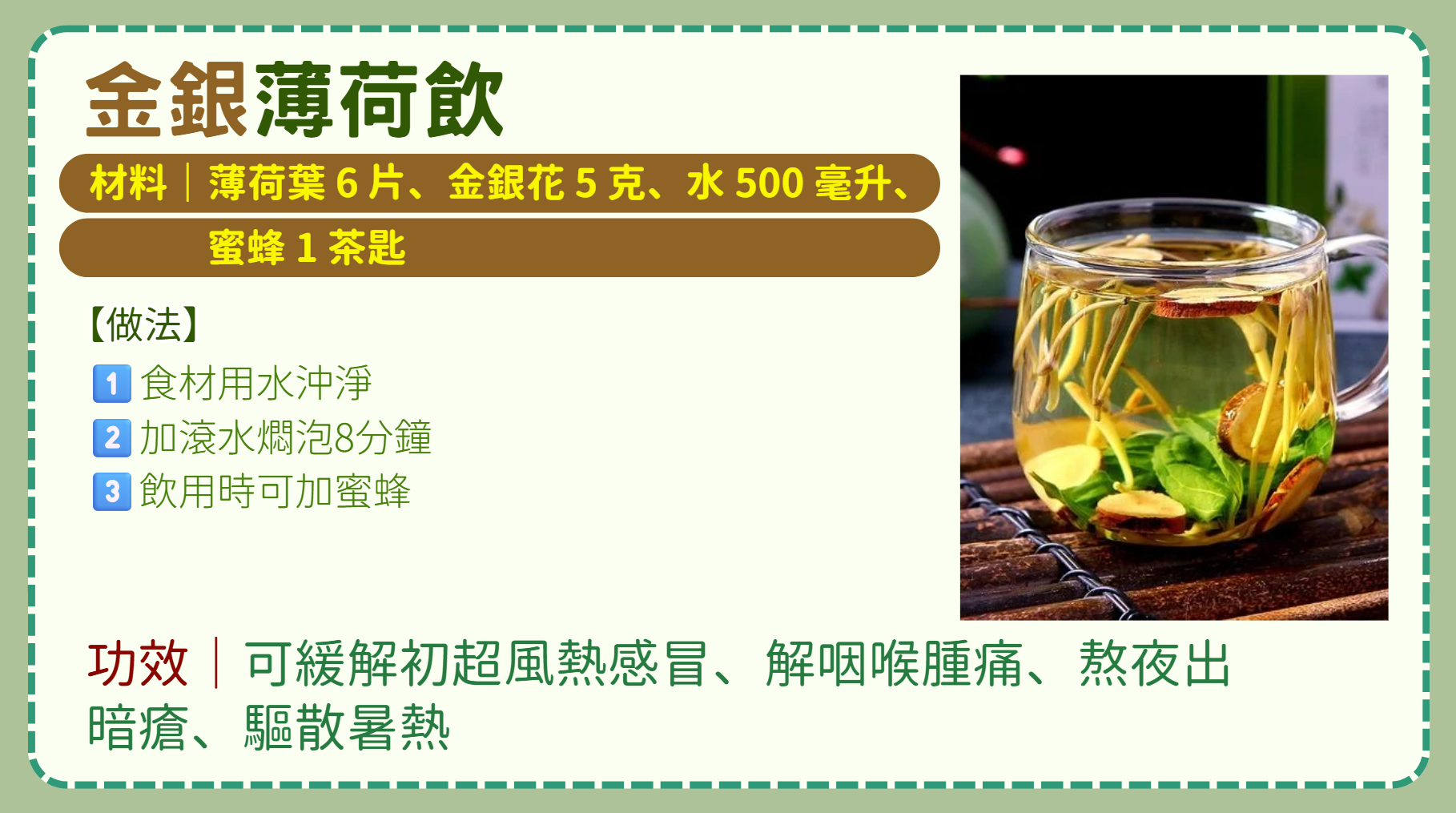 🌿材料|薄荷葉 6 片、金銀花 5 克、水 500 毫升、蜜蜂 1 茶匙