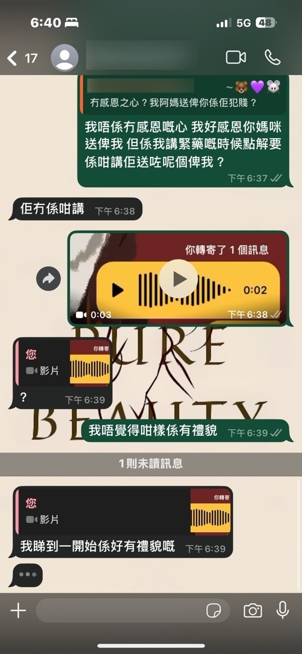 「我堅持要退錢,而佢哋個態度開始亂嚟,仲錄音講『你係高尚人,咁樣話我呀?』、『我打份工唔係畀你X』、『點解你可以咁樣嘅?』。」