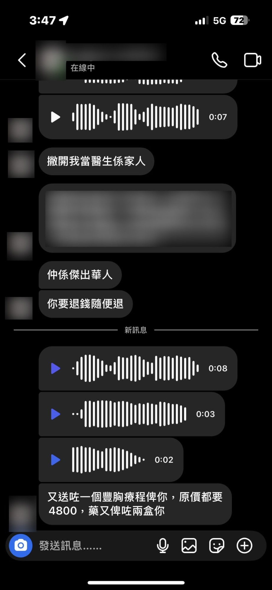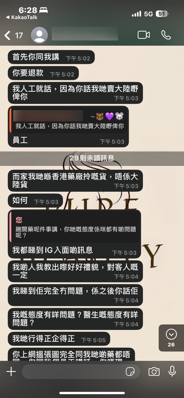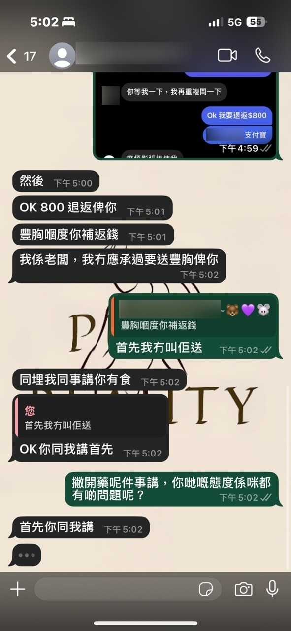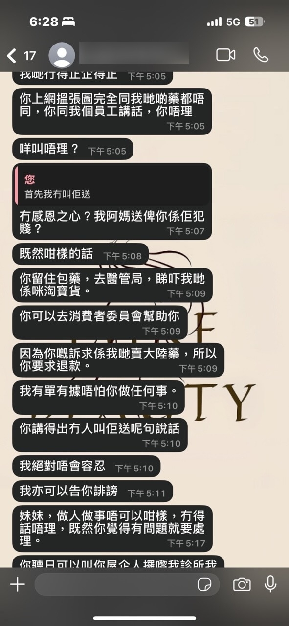 事主指後來直接在WhatsApp跟診所老闆理論,形容對方態度惡劣,要求事主支付豐胸療程的費用,又著她報警,或向消委會或醫管局投訴。對此,事主表示後來已放棄要求對方退款,對方亦提供證據證明藥物是在本港取得,惟她不滿老闆的言辭態度: