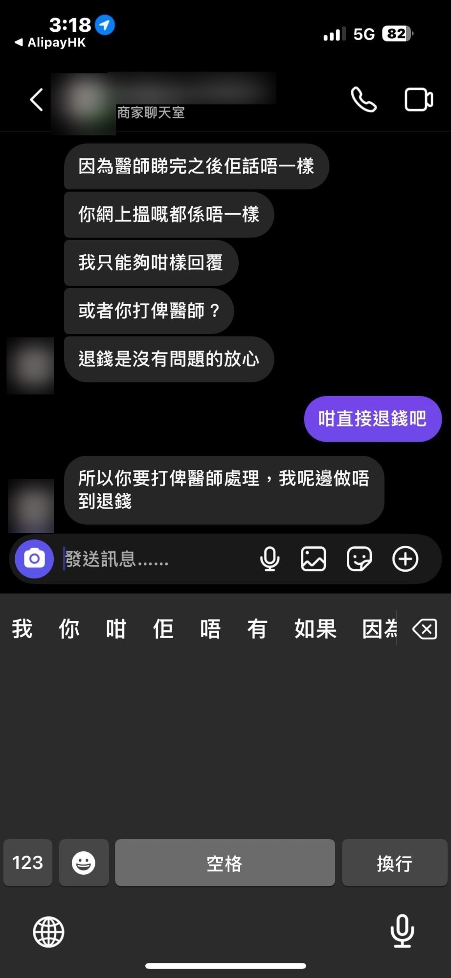「做生意用咁嘅態度對客係咪有問題?原來幫我做療程個醫師都係佢阿媽嚟嘅,個態度真係令到我好唔舒服,話晒我都喺舖頭消費咗成5,000蚊,都唔係一筆細數目呀。再者我自問態度並冇問題,況且我係消費者,作為商家咁嘅態度真係正常咩?」