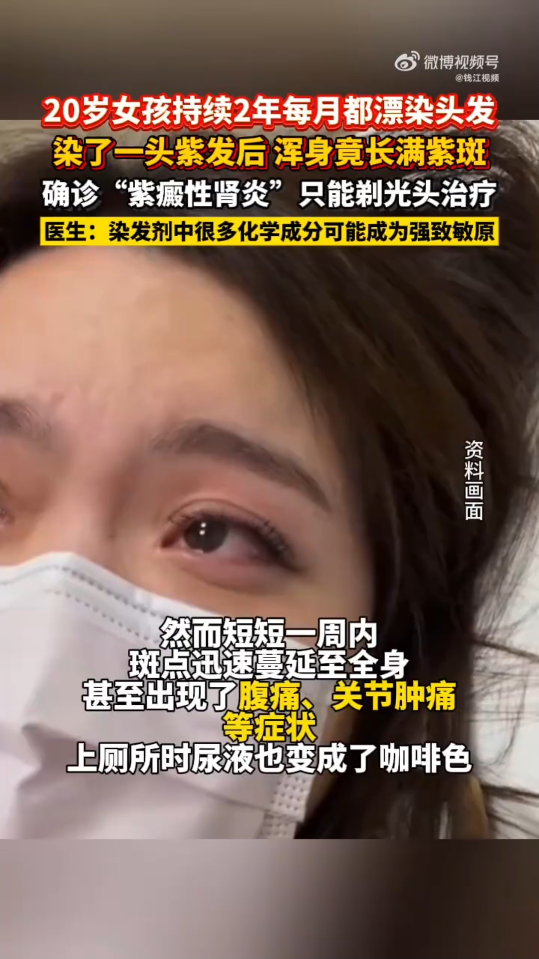 【染髮/紫斑/啡尿/腎衰竭/剃頭/保命/安全/食物/排毒/漂頭髮/漂髮/染頭髮】綜合內媒報道,浙江杭州一名20歲少女小琳(化名),平日在社交平台擁有不少粉絲。她為維持跟偶像同款的淺色髮型,連續2年每月漂染頭髮,不僅每月補染髮根,還會定期更換髮色,最高紀錄曾單次漂染3次,並會使用護色洗頭水。