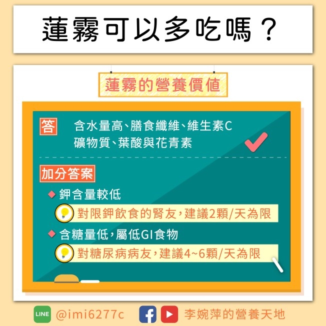 她表示,跟許多水果相比,蓮霧含糖量較低,且屬低GI食物,糖尿病患者都可以吃,同時有多份外國文獻指出,蓮霧對調節血糖有好處。一份2019年的研究認為,從蓮霧果實中所分離出的一種新型水溶性多醣成分WAFP,能抑制α-葡萄糖苷酶的活性,即這種成分能抑制澱粉、雙醣類分解成單醣,避免血糖過度波動,有助延緩血糖上升。