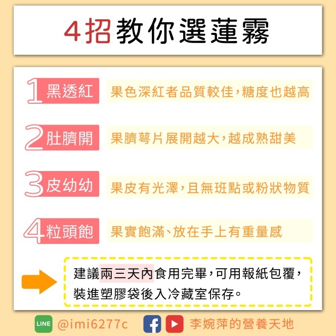 【蓮霧/抗發炎/護心血管/抗癌/血糖/好膽固醇/慎食/部位/營養/保存/變質】台灣營養師李婉萍曾在部落格分享,指就營養價值來看,蓮霧的含水量高達90%,1個果實較大、重量約100至125公克的紅蓮霧,熱量僅34至42.5大卡。
