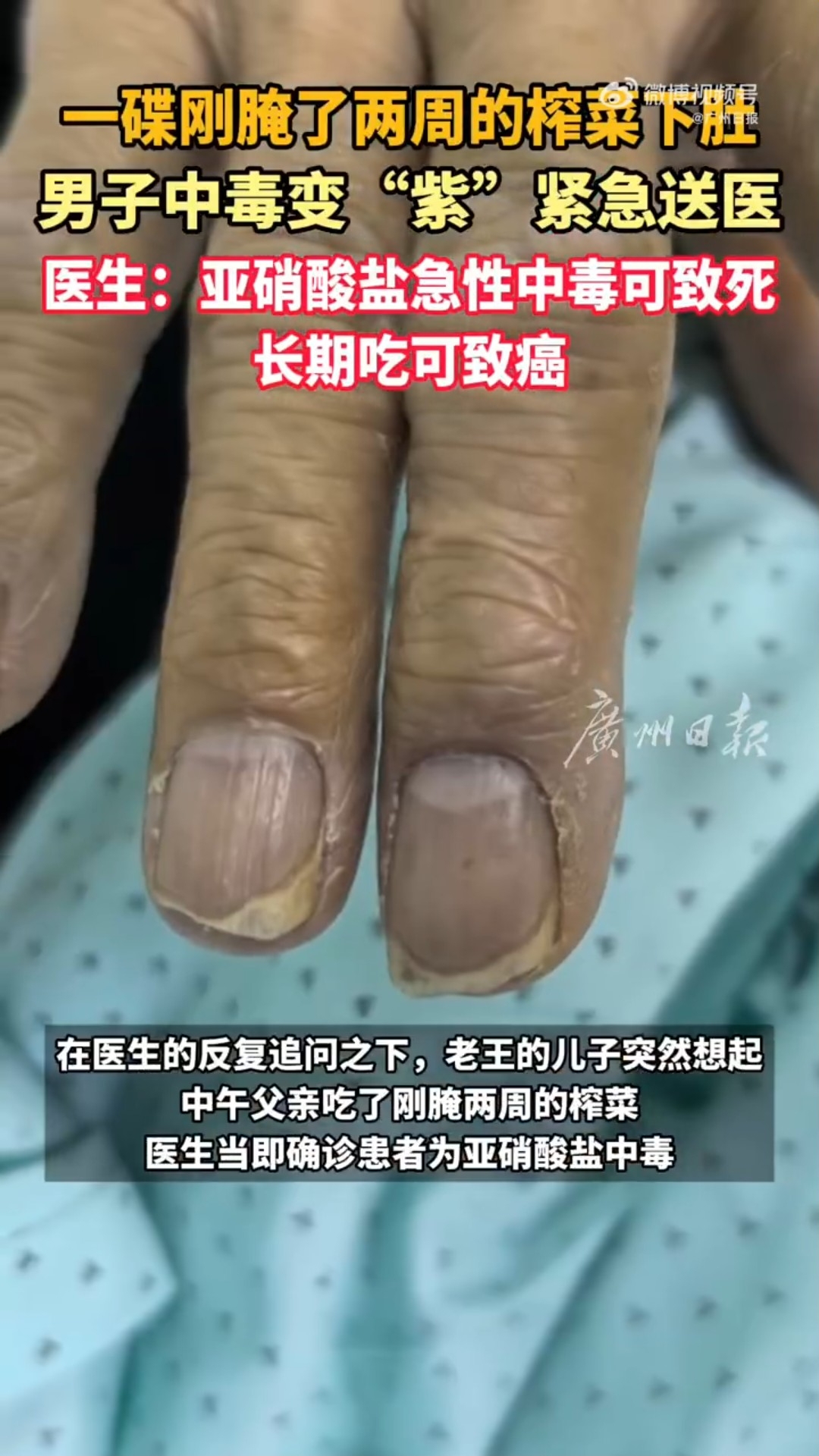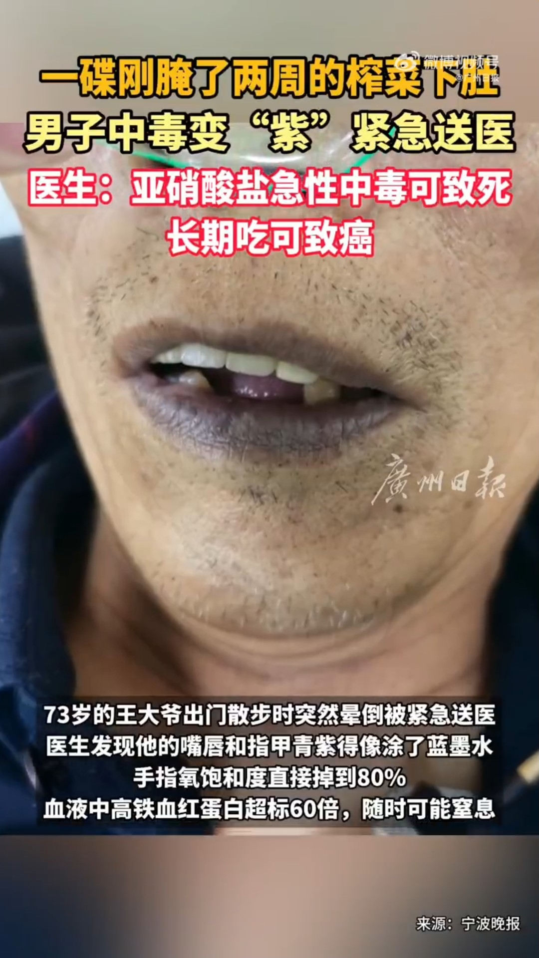 【暈倒/全身發紫/自製/食物/亞硝酸鹽中毒/窒息/致死/症狀】綜合內媒報道,浙江寧波一名73歲男子日前吃了一碟自己醃製的榨菜,飯後外出散步,未料走沒幾步路就暈倒,且嘴唇、指甲等部位發紫。